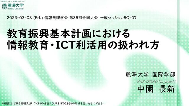 教育振興基本計画における 情報教育・ICT利活用の扱われ方 麗澤大学 国際学部 NAKAZONO Nagayoshi 中園 長新 2023-03-03 (Fri.)