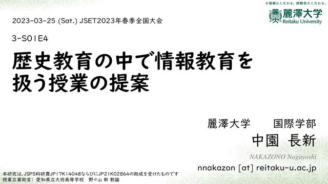 reitaku-u.ac.jp 2023-03-25 (Sat.) JSET2023年春季全国大会 本研究は、JSPS科研費JP17K14048ならびにJP21K02864の助成を受けたものです 授業立案助言: 愛知県立大府高等学校 野々山 新 教諭 3-S01E4