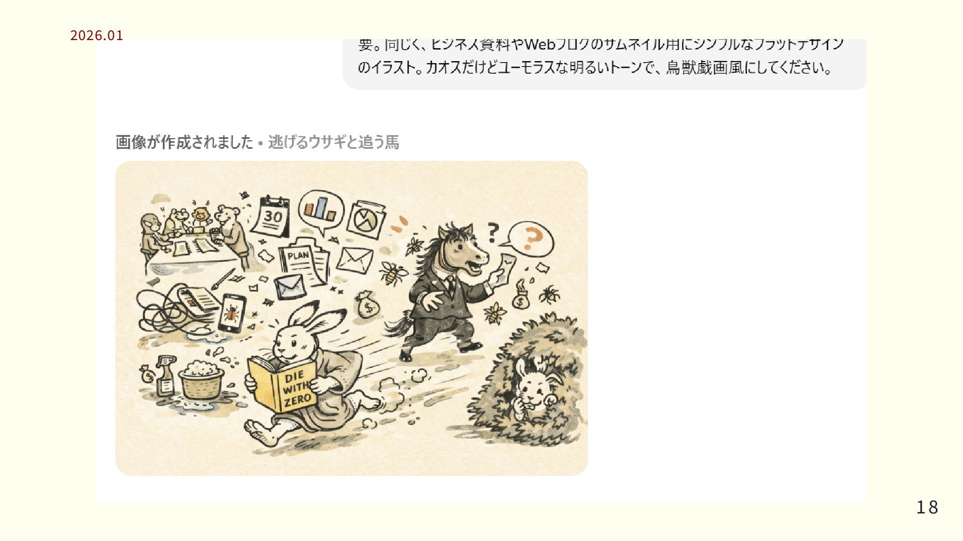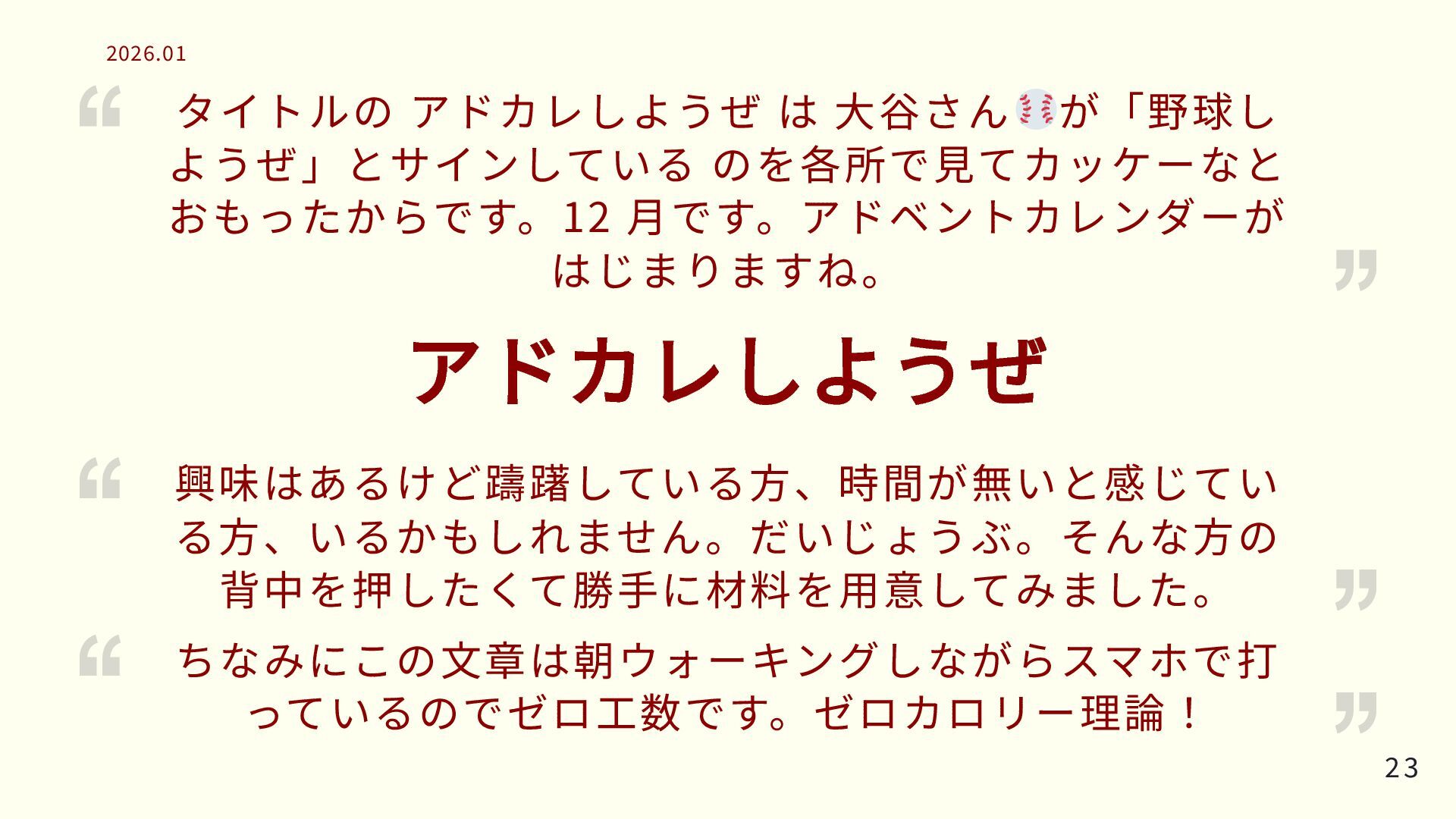 はじまりますね。 興味はあるけど躊躇している方、時間が無いと感じてい る方、いるかもしれません。だいじょうぶ。そんな方の 背中を押したくて勝手に材料を用意してみました。 ちなみにこの文章は朝ウォーキングしながらスマホで打 っているのでゼロ工数です。ゼロカロリー理論! 23 23 2026.01 2026.01