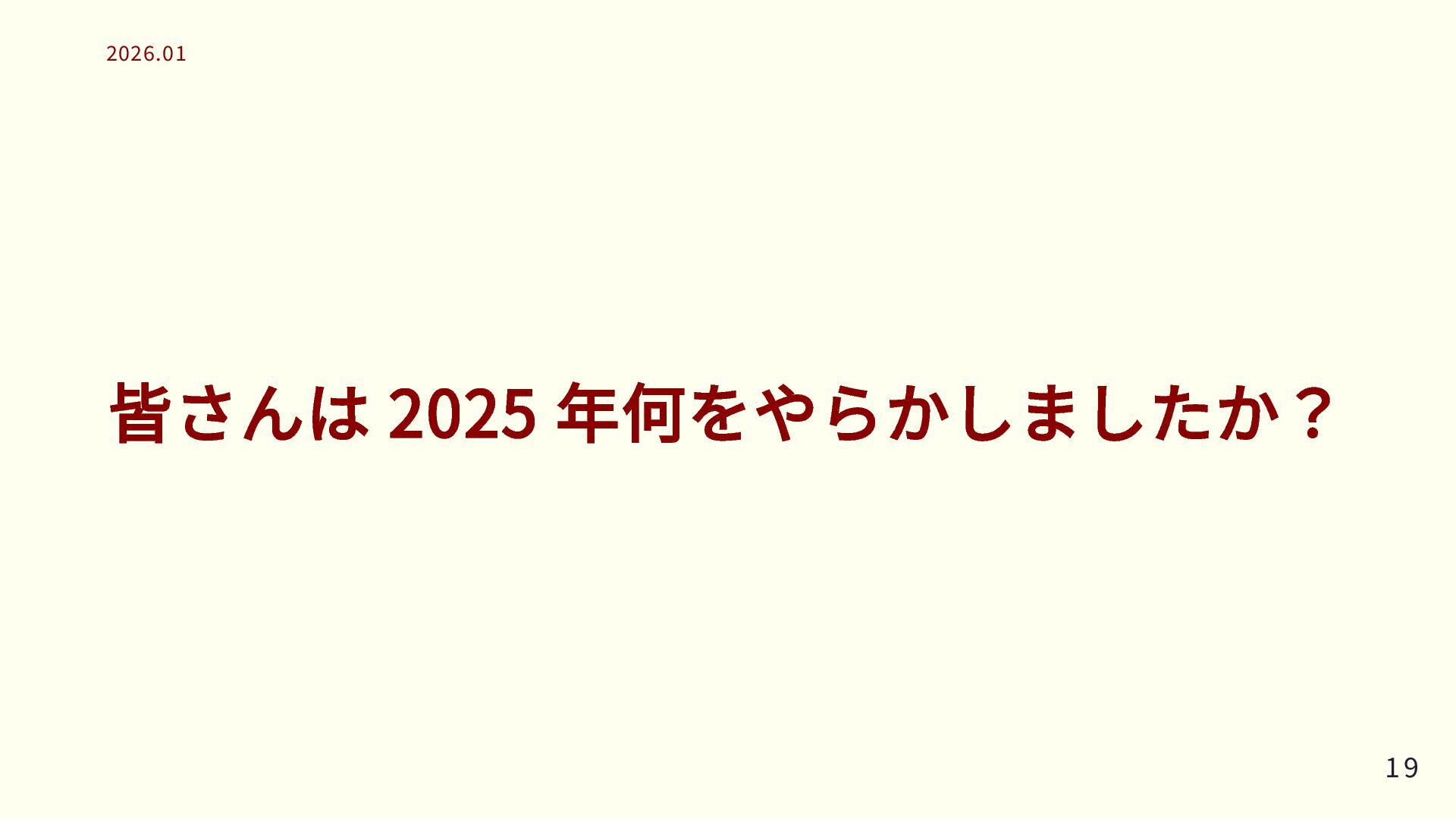 皆さんは 2025 年何をやらかしましたか? 19 19 2026.01 2026.01