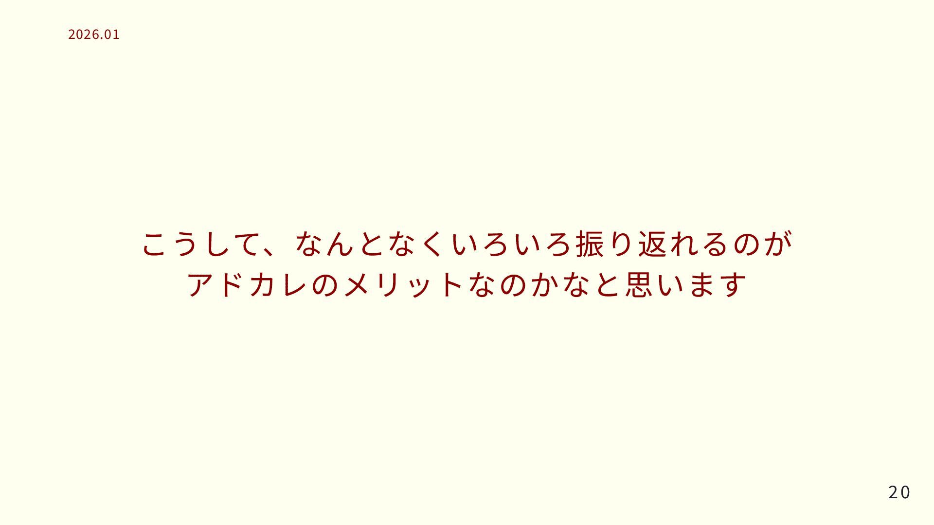 こうして、なんとなくいろいろ振り返れるのが アドカレのメリットなのかなと思います 20 20 2026.01 2026.01