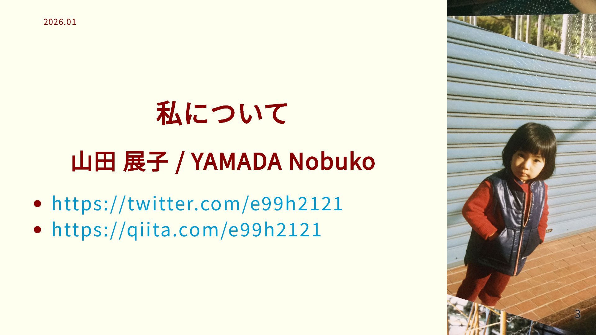 私について 山田 展子 / YAMADA Nobuko https://twitter.com/e99h2121 https://qiita.com/e99h2121 2026.01 2026.01