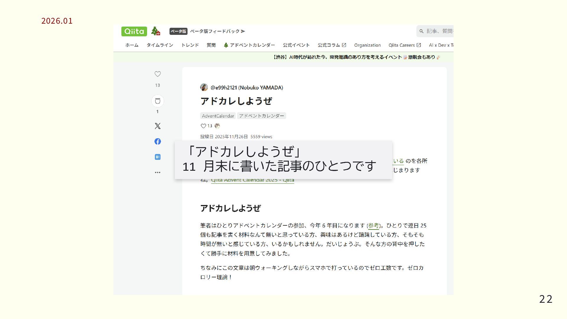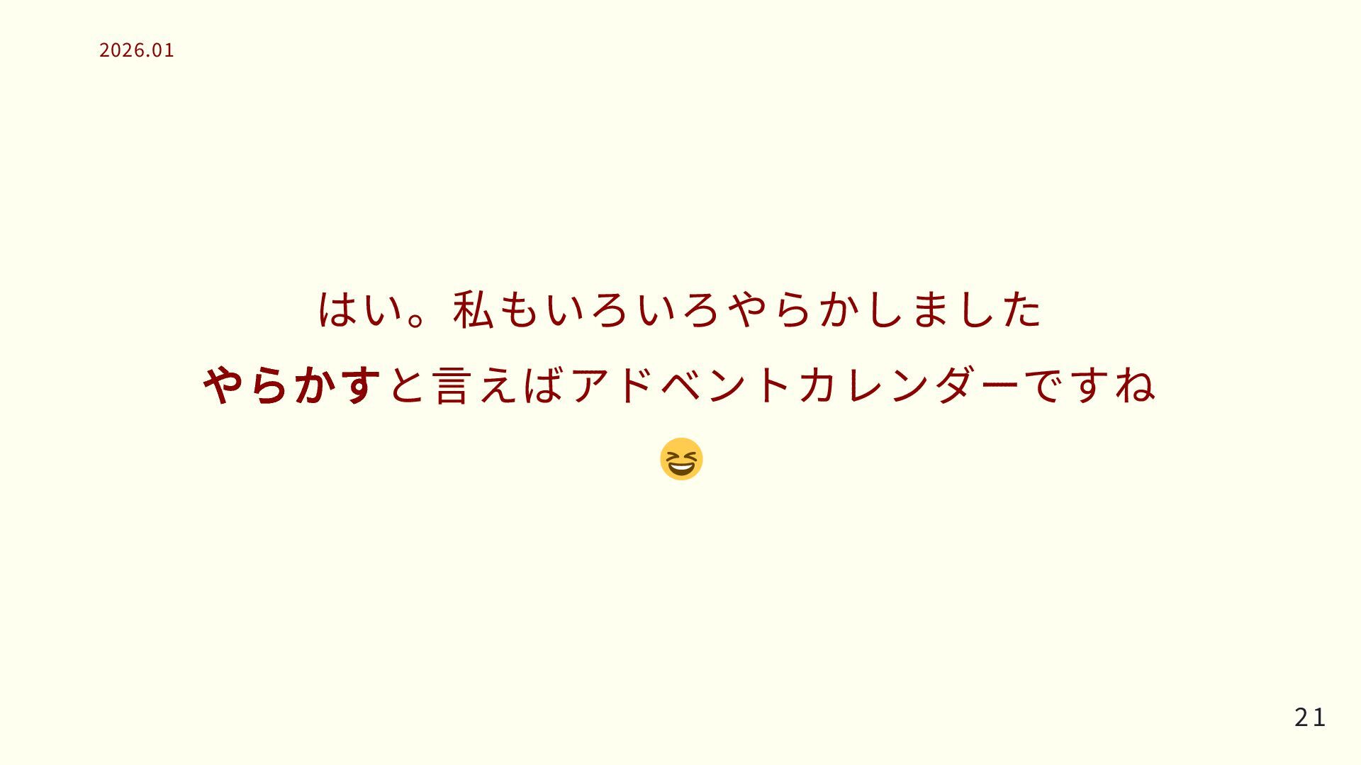 はい。私もいろいろやらかしました やらかすと言えばアドベントカレンダーですね 21 21 2026.01 2026.01