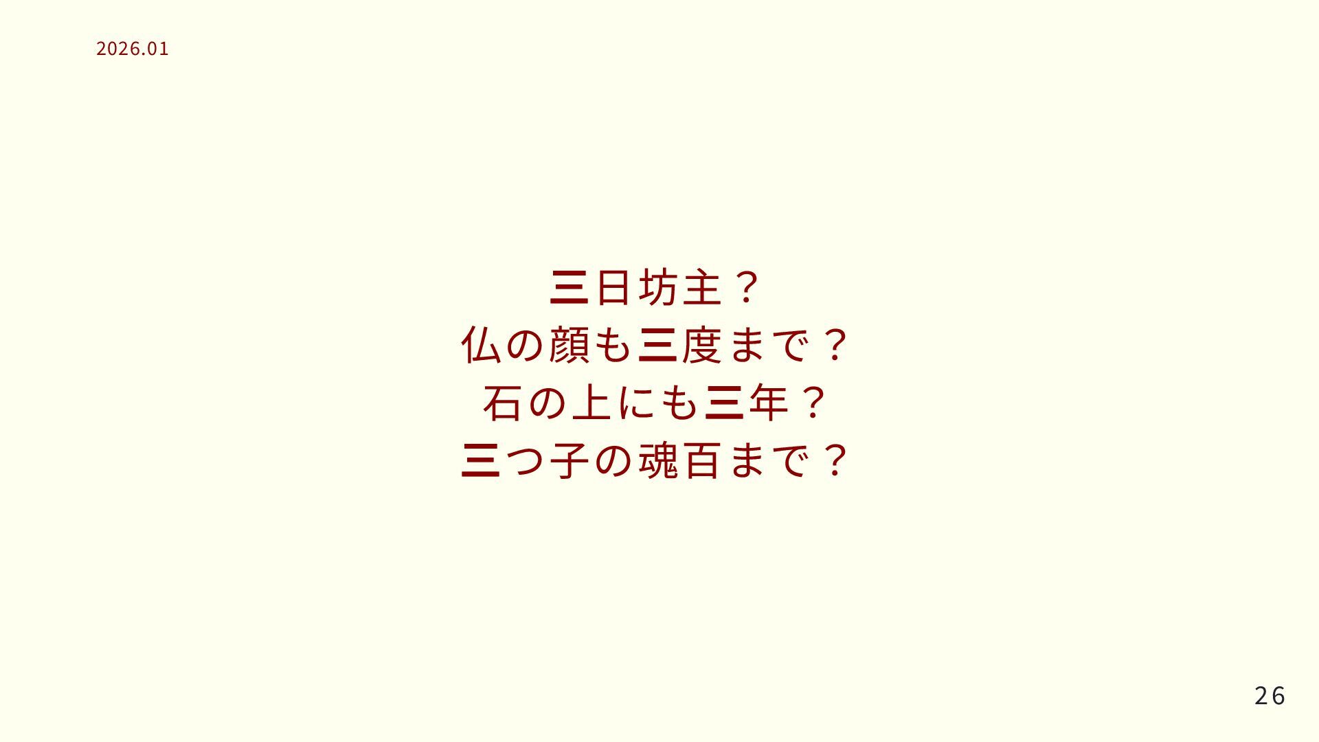 三日坊主? 仏の顔も 三度まで? 石の上にも 三年? 三つ子の魂百まで? 26 26 2026.01 2026.01