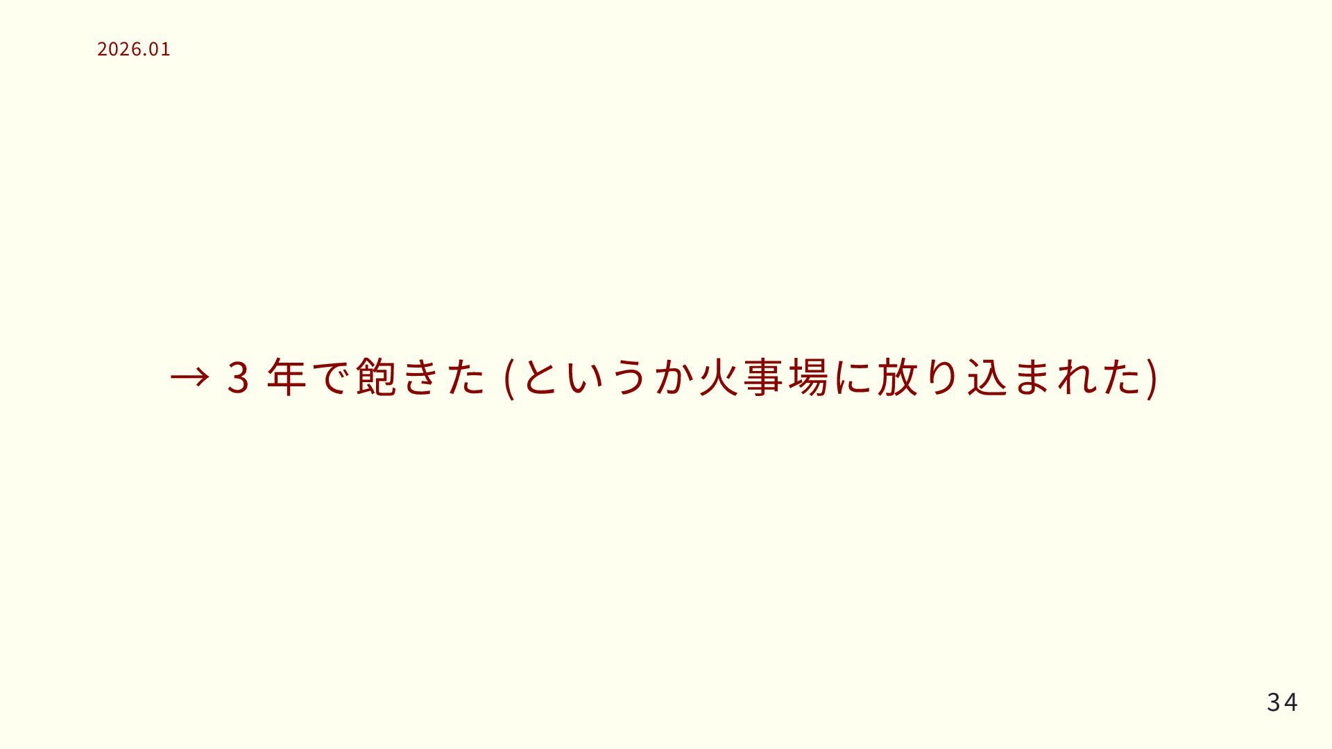 → 3 年で飽きた (というか火事場に放り込まれた) 34 34 2026.01 2026.01