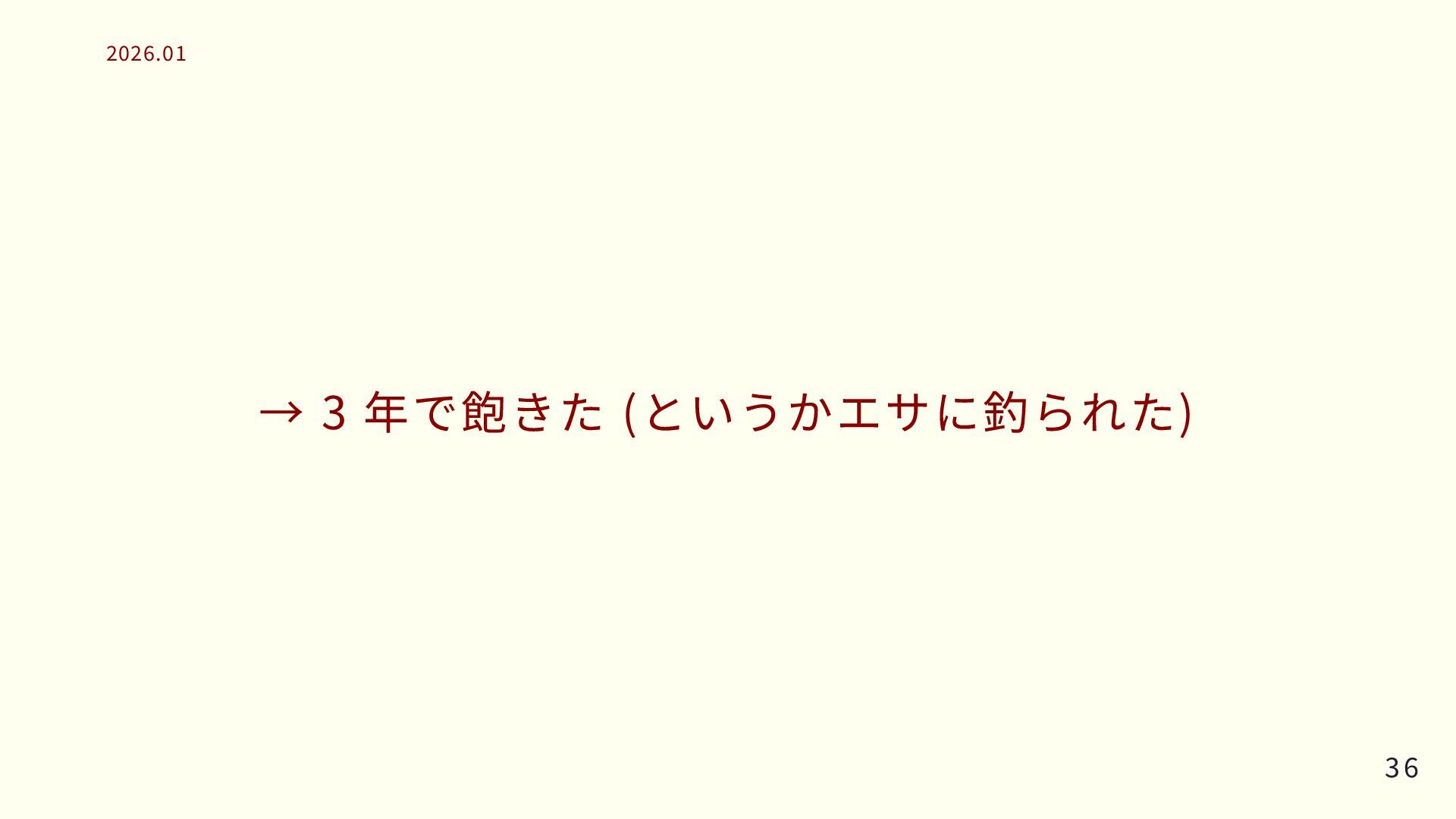→ 3 年で飽きた (というかエサに釣られた) 36 36 2026.01 2026.01