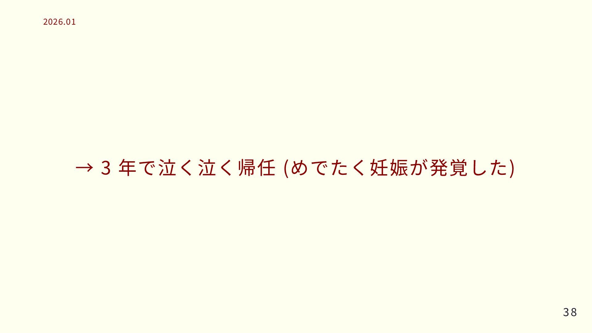 → 3 年で泣く泣く帰任 (めでたく妊娠が発覚した) 38 38 2026.01 2026.01