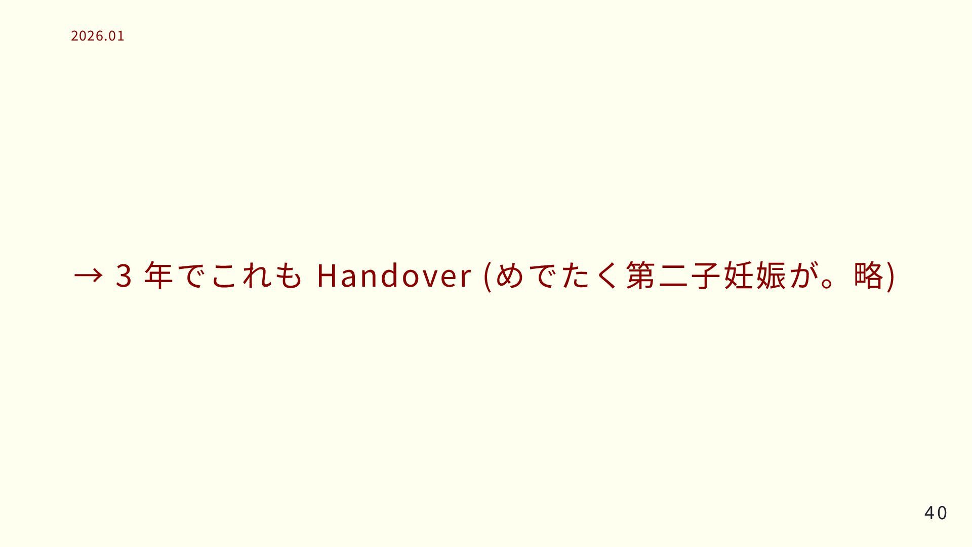 → 3 年でこれも Handover (めでたく第二子妊娠が。略) 40 40 2026.01 2026.01
