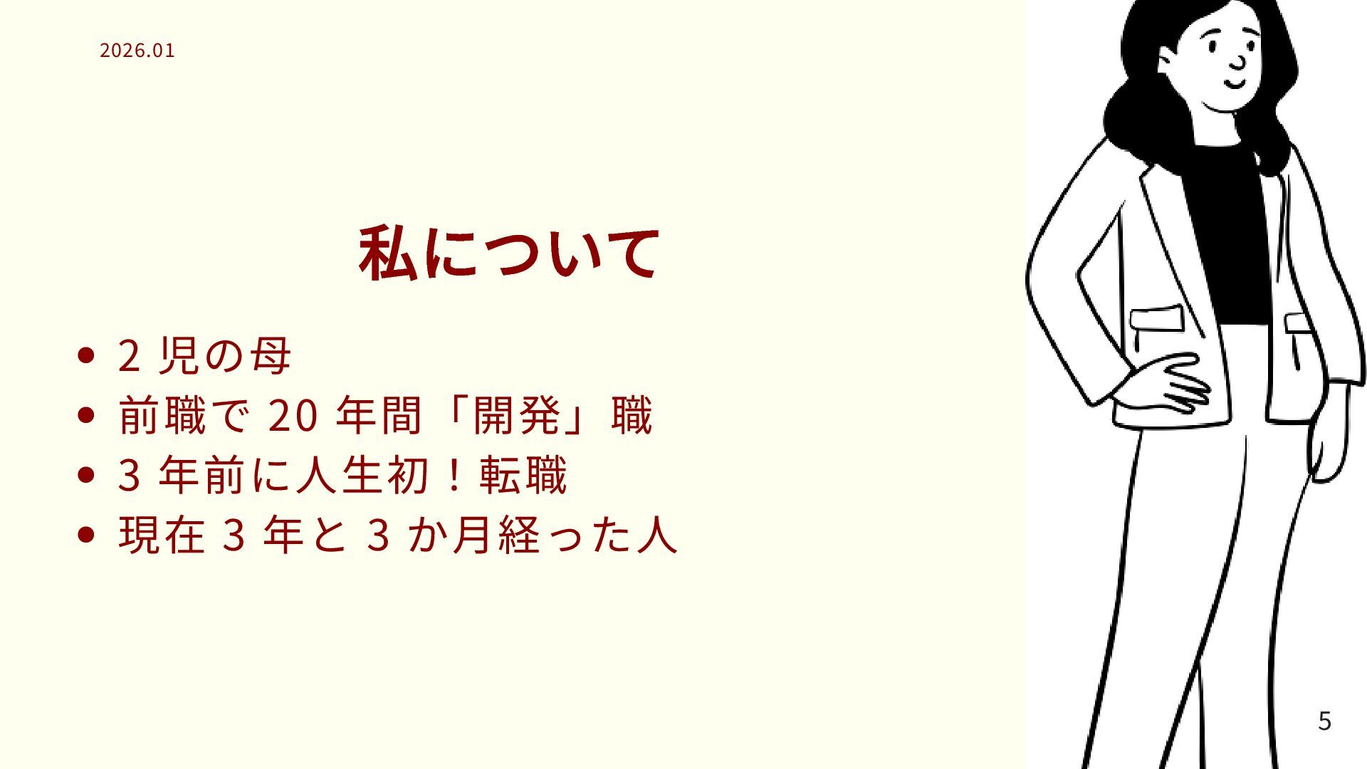 私について 2 児の母 前職で 20 年間「開発」職 3 年前に人生初!転職 現在 3