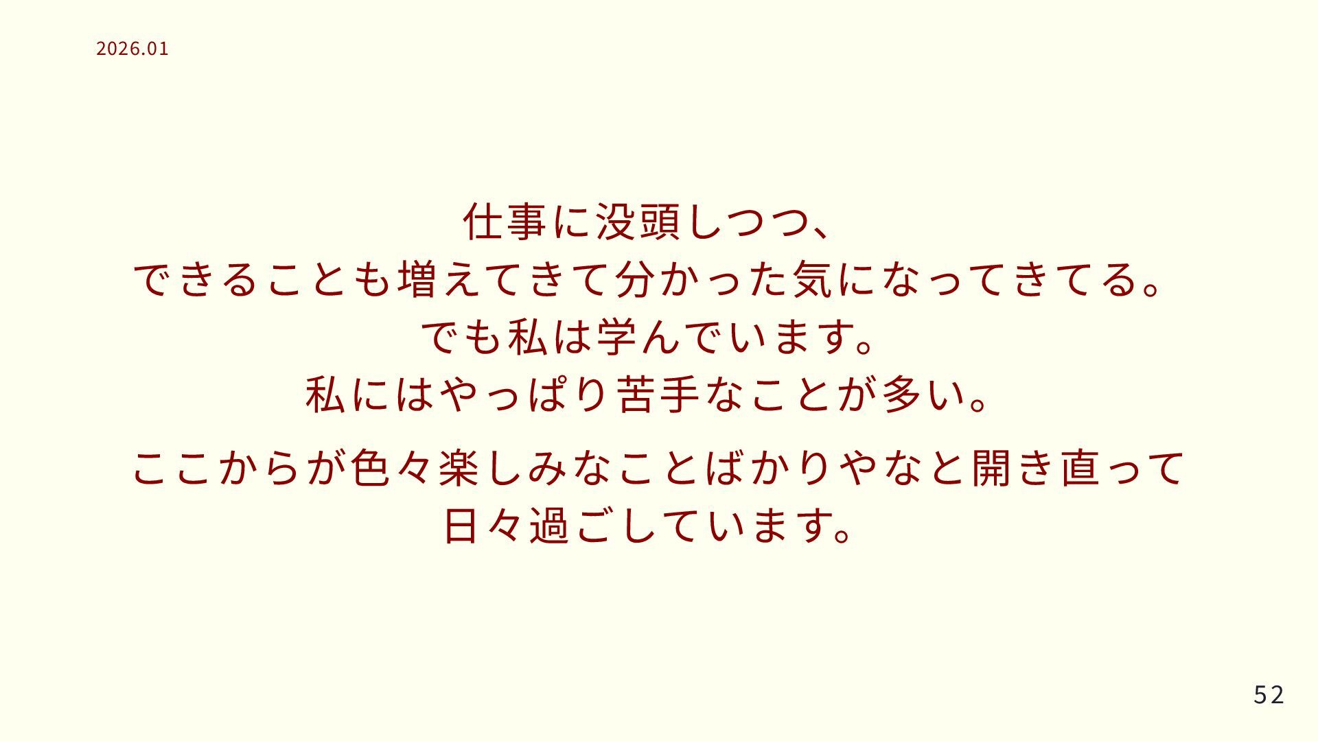 仕事に没頭しつつ、 できることも増えてきて分かった気になってきてる。 でも私は学んでいます。 私にはやっぱり苦手なことが多い。 ここからが色々楽しみなことばかりやなと開き直って 日々過ごしています。 52 52 2026.01 2026.01