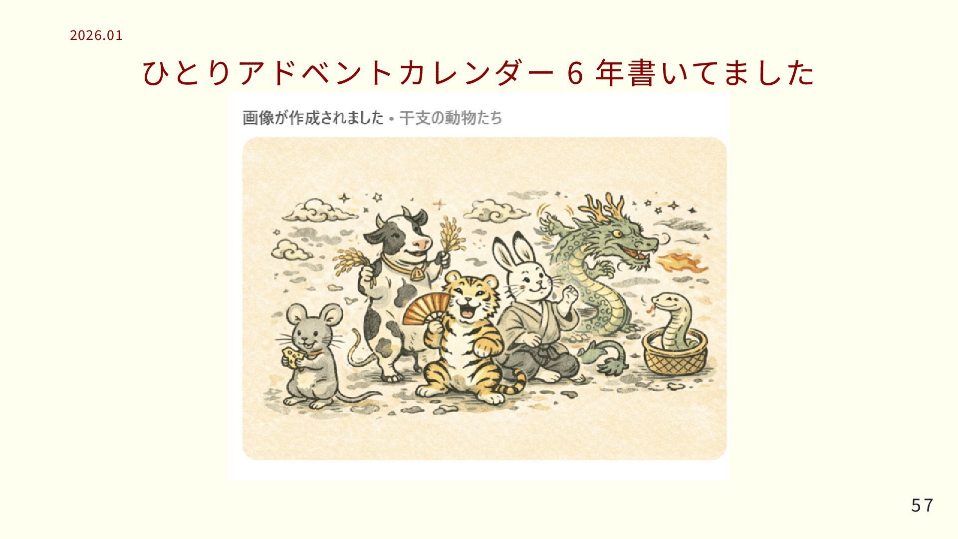 また ひとりアドベントカレンダー をしました "Advent Calendaring" 「3 年で飽きる」というテーマで書いてみておりました 2026.01 2026.01 55