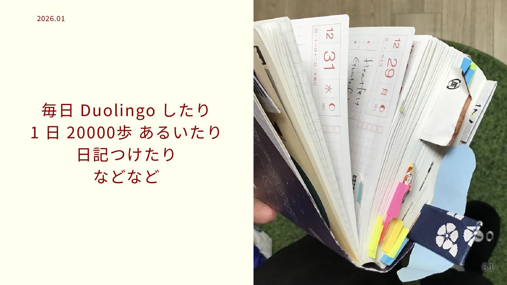 毎日 Duolingo したり 1 日 20000歩 あるいたり 日記つけたり などなど 2026.01