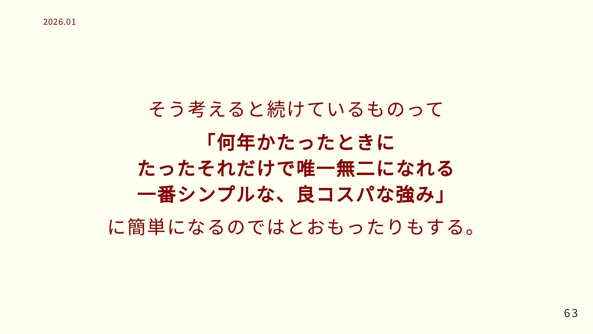 そう考えると続けているものって 「何年かたったときに たったそれだけで唯一無二になれる 一番シンプルな、良コスパな強み」 に簡単になるのではとおもったりもする。 63 63 2026.01 2026.01