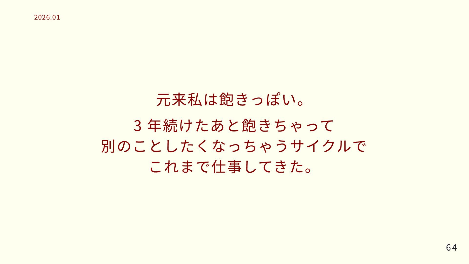 元来私は飽きっぽい。 3 年続けたあと飽きちゃって 別のことしたくなっちゃうサイクルで これまで仕事してきた。 64 64 2026.01 2026.01