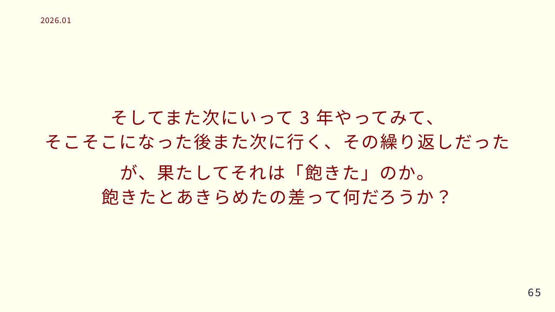 そしてまた次にいって 3 年やってみて、 そこそこになった後また次に行く、その繰り返しだった が、果たしてそれは「飽きた」のか。 飽きたとあきらめたの差って何だろうか? 65 65 2026.01 2026.01
