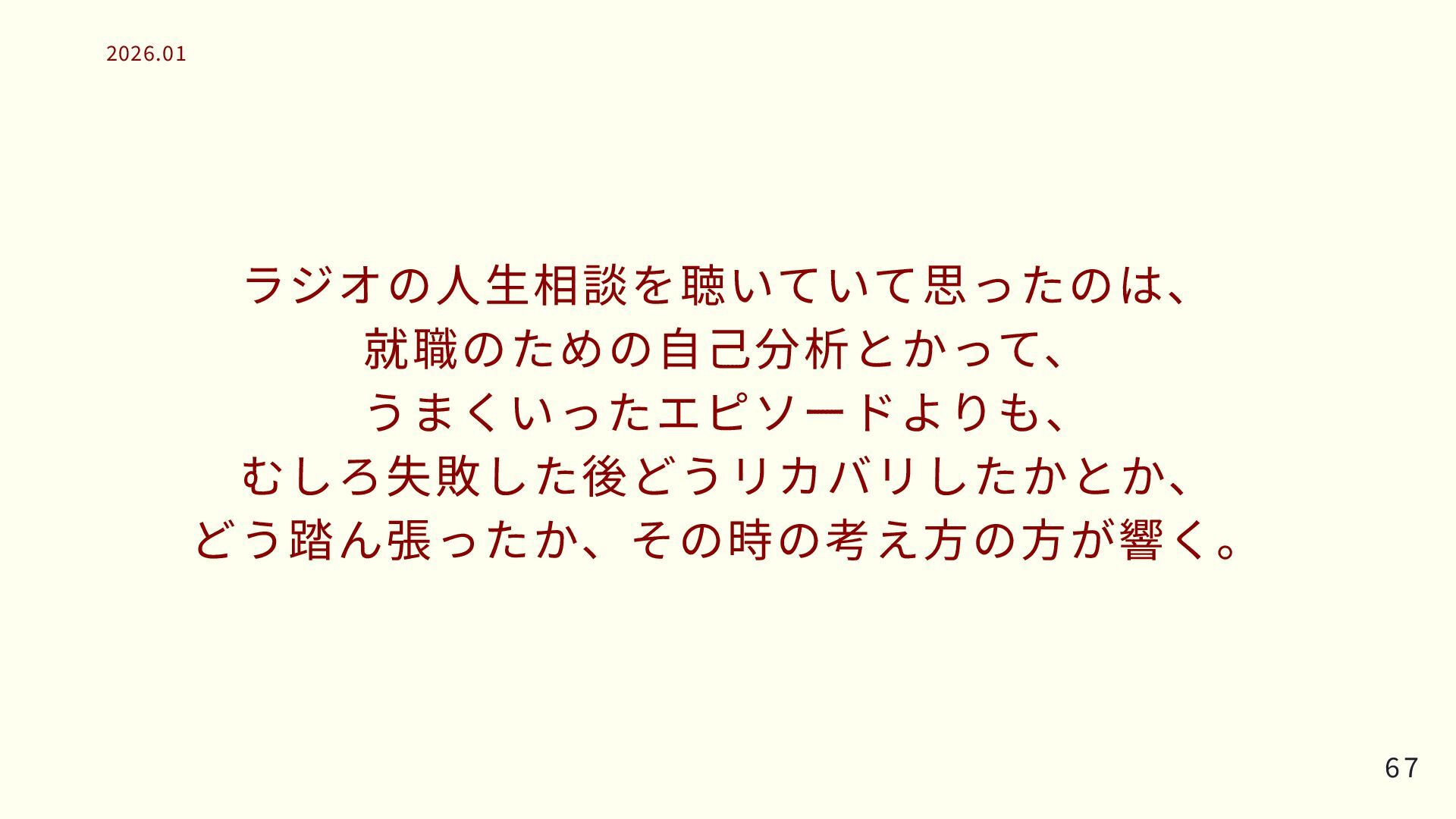 ラジオの人生相談を聴いていて思ったのは、 就職のための自己分析とかって、 うまくいったエピソードよりも、 むしろ失敗した後どうリカバリしたかとか、 どう踏ん張ったか、その時の考え方の方が響く。 67 67 2026.01 2026.01