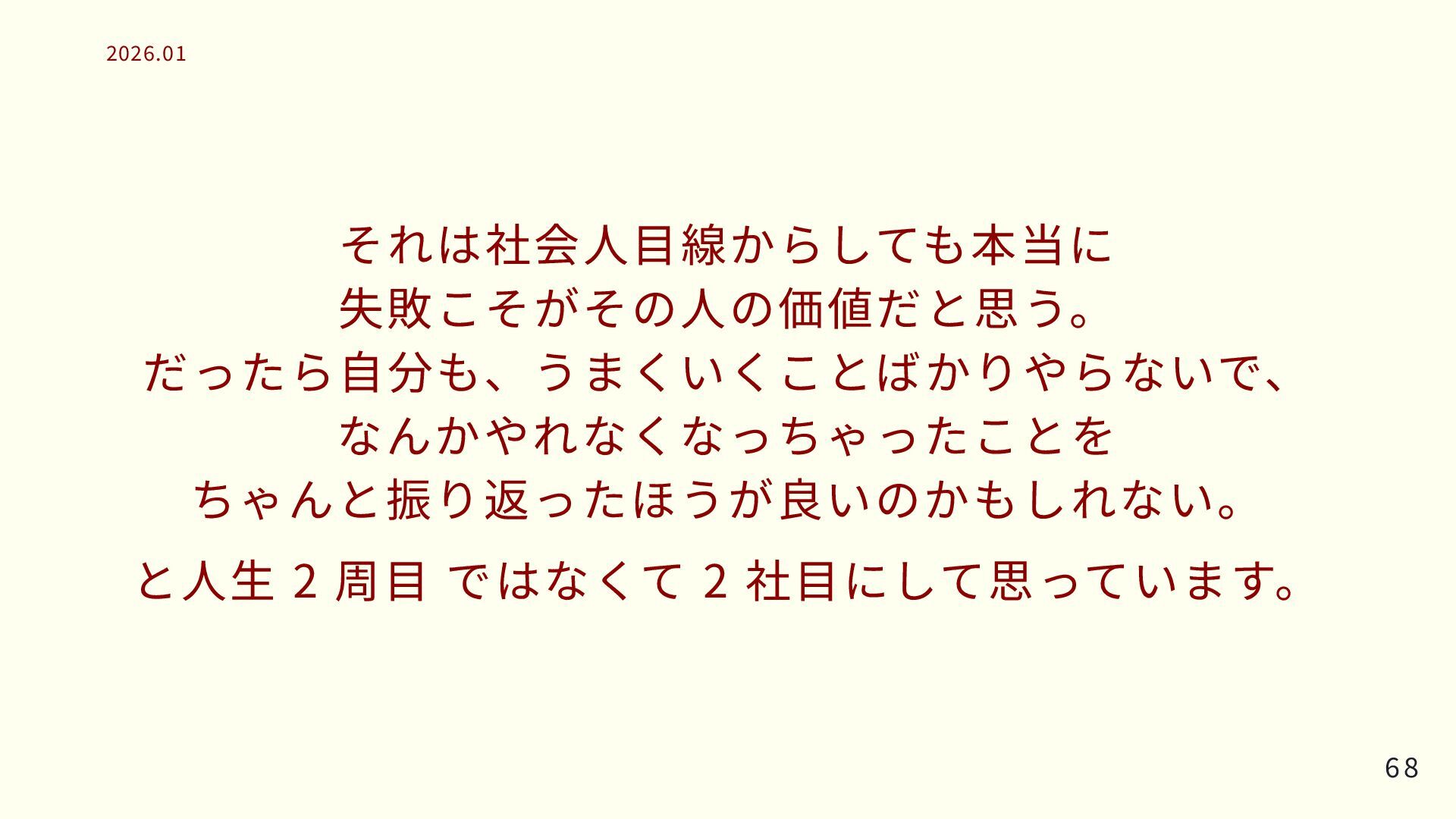 それは社会人目線からしても本当に 失敗こそがその人の価値だと思う。 だったら自分も、うまくいくことばかりやらないで、 なんかやれなくなっちゃったことを ちゃんと振り返ったほうが良いのかもしれない。 と人生 2 周目 ではなくて 2