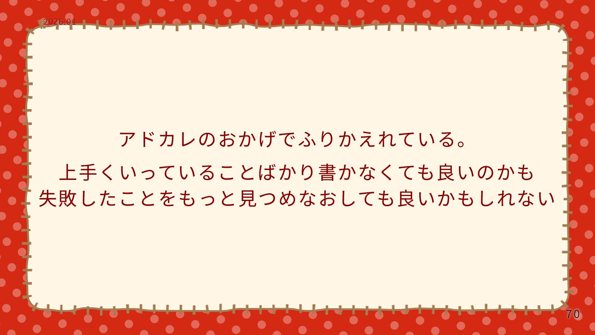 アドカレのおかげでふりかえれている。 上手くいっていることばかり書かなくても良いのかも 失敗したことをもっと見つめなおしても良いかもしれない 2026.01 2026.01 70 70