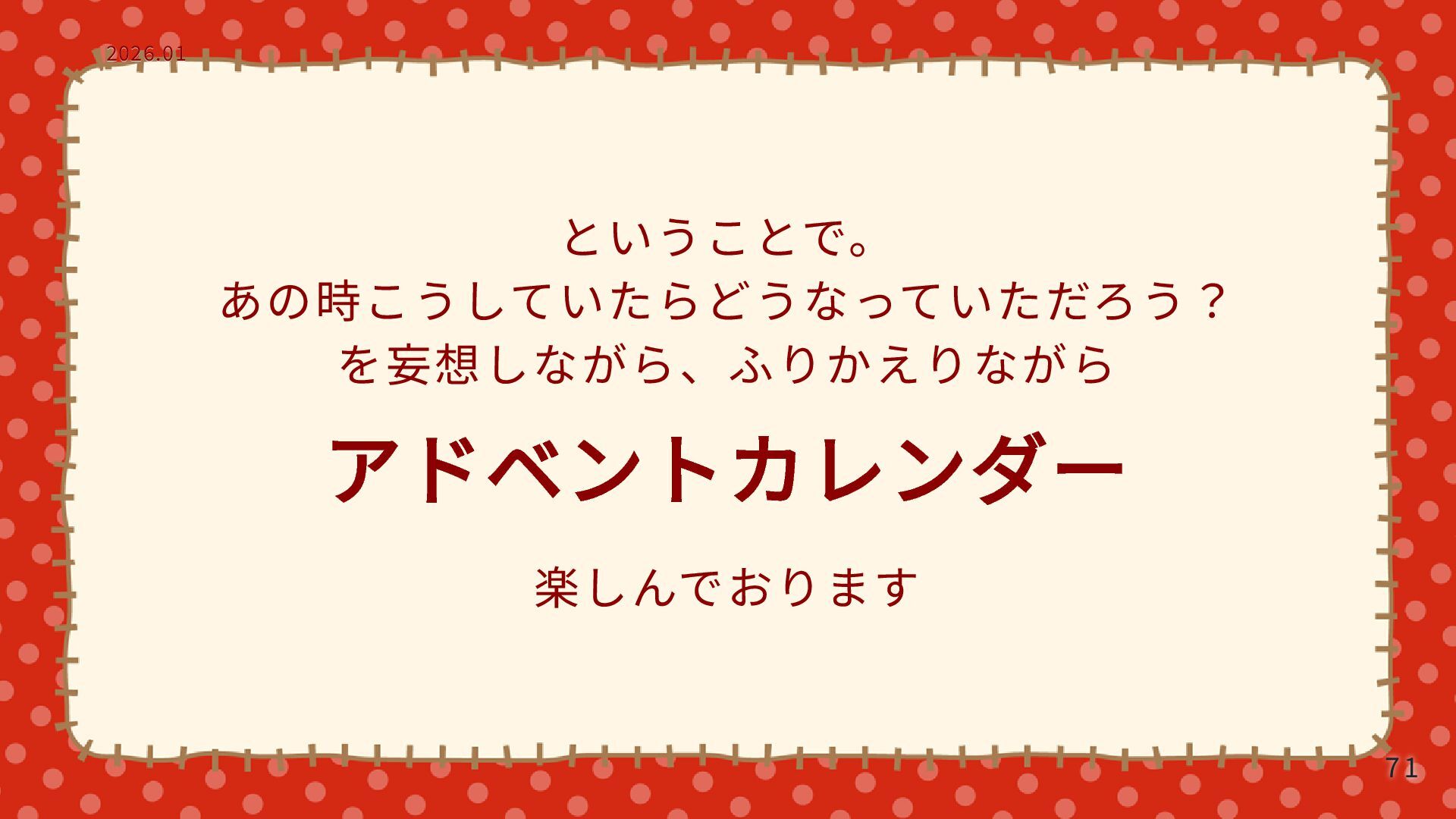 ということで。 あの時こうしていたらどうなっていただろう? を妄想しながら、ふりかえりながら アドベントカレンダー 楽しんでおります 2026.01 2026.01 71 71