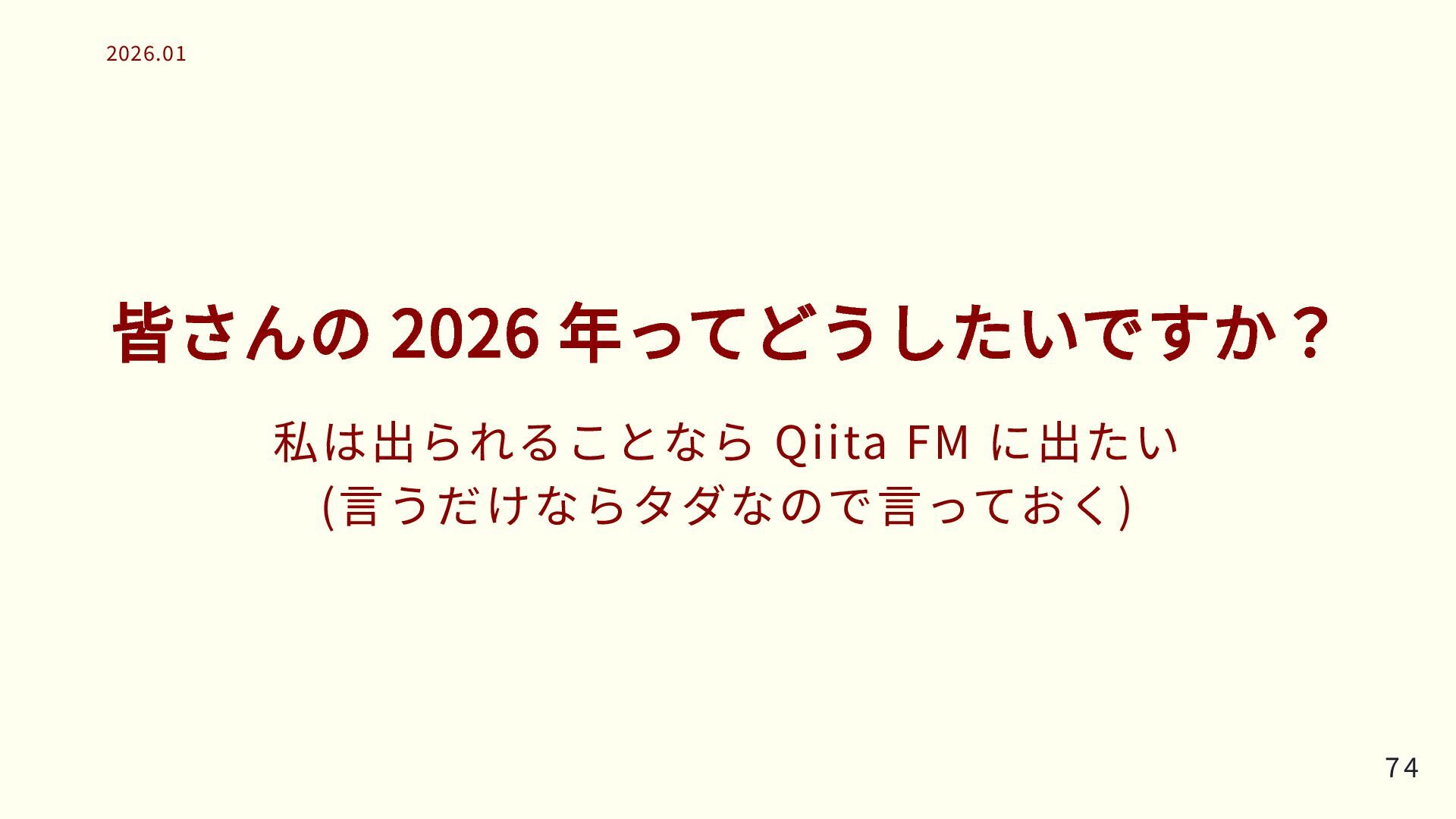 皆さんの 2026 年ってどうしたいですか? 私は出られることなら Qiita FM に出たい (言うだけならタダなので言っておく) 74 74