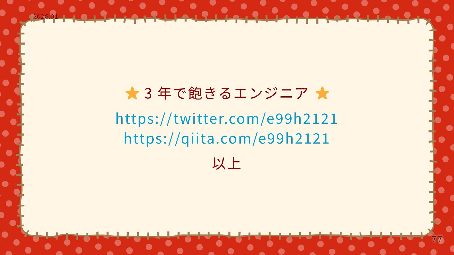 3 年で飽きるエンジニア https://twitter.com/e99h2121 https://qiita.com/e99h2121 以上 2026.01 2026.01 77 77