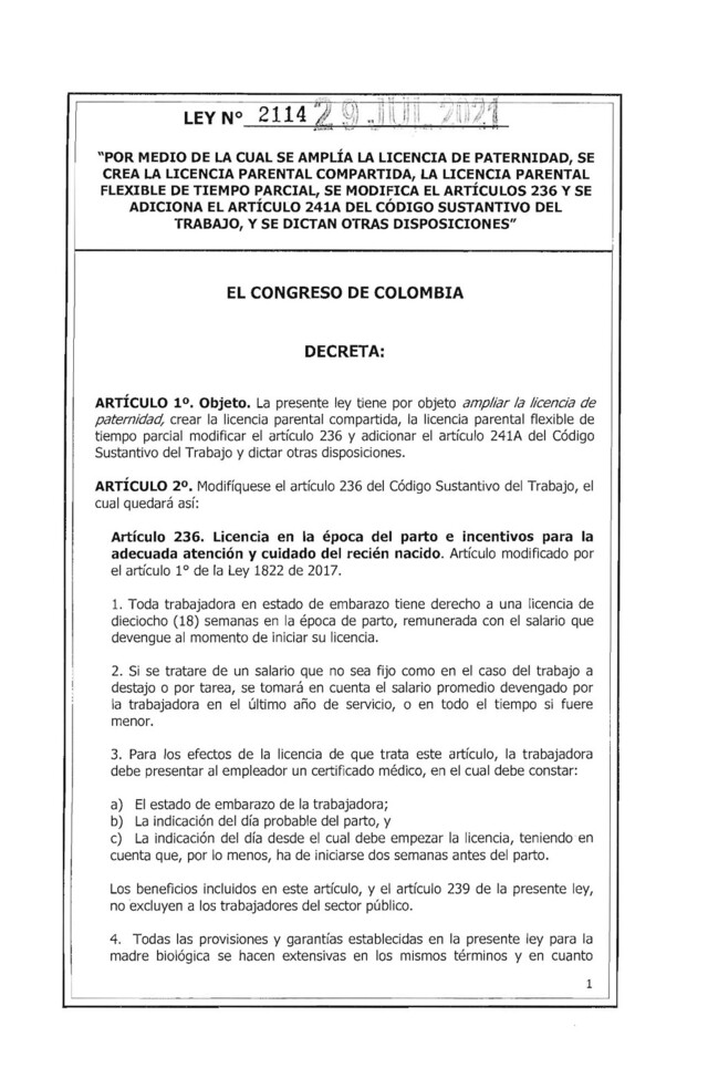 CUAL SE AMPLÍA LA LICENCIA DE PATERNIDAD, SE CREA LA LICENCIA PARENTAL COMPARTIDA, LA LICENCIA PARENTAL FLEXIBLE DE TIEMPO PARCIAL, SE MODIFICA EL ARTÍCULOS 236 Y SE ADICIONA EL ARTÍCULO 241A DEL CÓDIGO SUSTANTIVO DEL TRABAJO, Y SE DICTAN OTRAS DISPOSICIONES" EL CONGRESO DE COLOMBIA DECRETA: ARTÍCULO 1°. Objeto. La presente ley tiene por objeto ampliar la licencia de paternidad, crear la licencia parental compartida, la licencia parental flexible de tiempo parcial modificar el artículo 236 y adicionar el artículo 241A del Código Sustantivo del Trabajo y dictar otras disposiciones, ARTÍCULO 2°. Modifíquese el artículo 236 del Código Sustantivo del Trabajo, el cual quedará así: Artículo 236. Licencia en la época del parto e incentivos para la adecuada atención y cuidado del recién nacido. Artículo modificado por el artículo 10 de la Ley 1822 de 2017. 1. Toda trabajadora en estado de embarazo tiene derecho a una licencia de dieciocho (18) semanas en la época de parto, remunerada con el salario que devengue al momento de iniciar su licencia. 2. Si se tratare de un salario que no sea fijo como en el caso del trabajo a destajo o por tarea, se tomará en cuenta el salario promedio devengado por la trabajadora en el último año de servicio, o en todo el tiempo si fuere menor. 3. Para los efectos de la licencia de que trata este artículo, la trabajadora debe presentar al empleador un certificado médico, en el cual debe constar: a) El estado de embarazo de la trabajadora; b) La indicación del día probable del parto, y e) La indicación del día desde el cual debe empezar la licencia, teniendo en cuenta que, por lo menos, ha de iniciarse dos semanas antes del parto. Los beneficios incluidos en este artículo, y el artículo 239 de la presente ley, no excluyen a los trabajadores del sector público. 4. Todas las provisiones y garantías establecidas en la presente ley para la madre biológica se hacen extensivas en los mismos términos y en cuanto 1