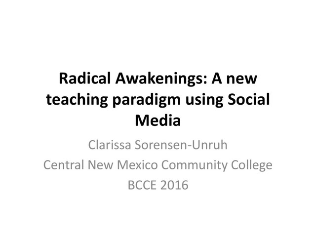 or Twitter account knows, social media permeates our culture and our lives. This talk focuses on one instructor’s integration of social media into her classroom and her teaching life as both a communication tool and a professional development outlet. Several strategies for social media use will be discussed as well as a delineation of which outlet best serves specific goals. Time will be available for discussion and questions from the audience.