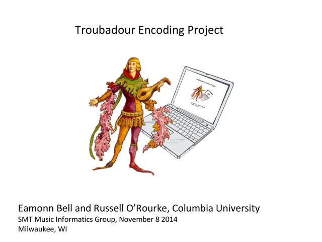 don’t roll your own ▪ Never • Ever • Humdrum/shell used for high-level stats • music21 also used ◦ Not amazing for future text underlay work • Google Docs, Wikispaces and the usual collaboration tools • Future component: web-app for gradsourcing proofreading