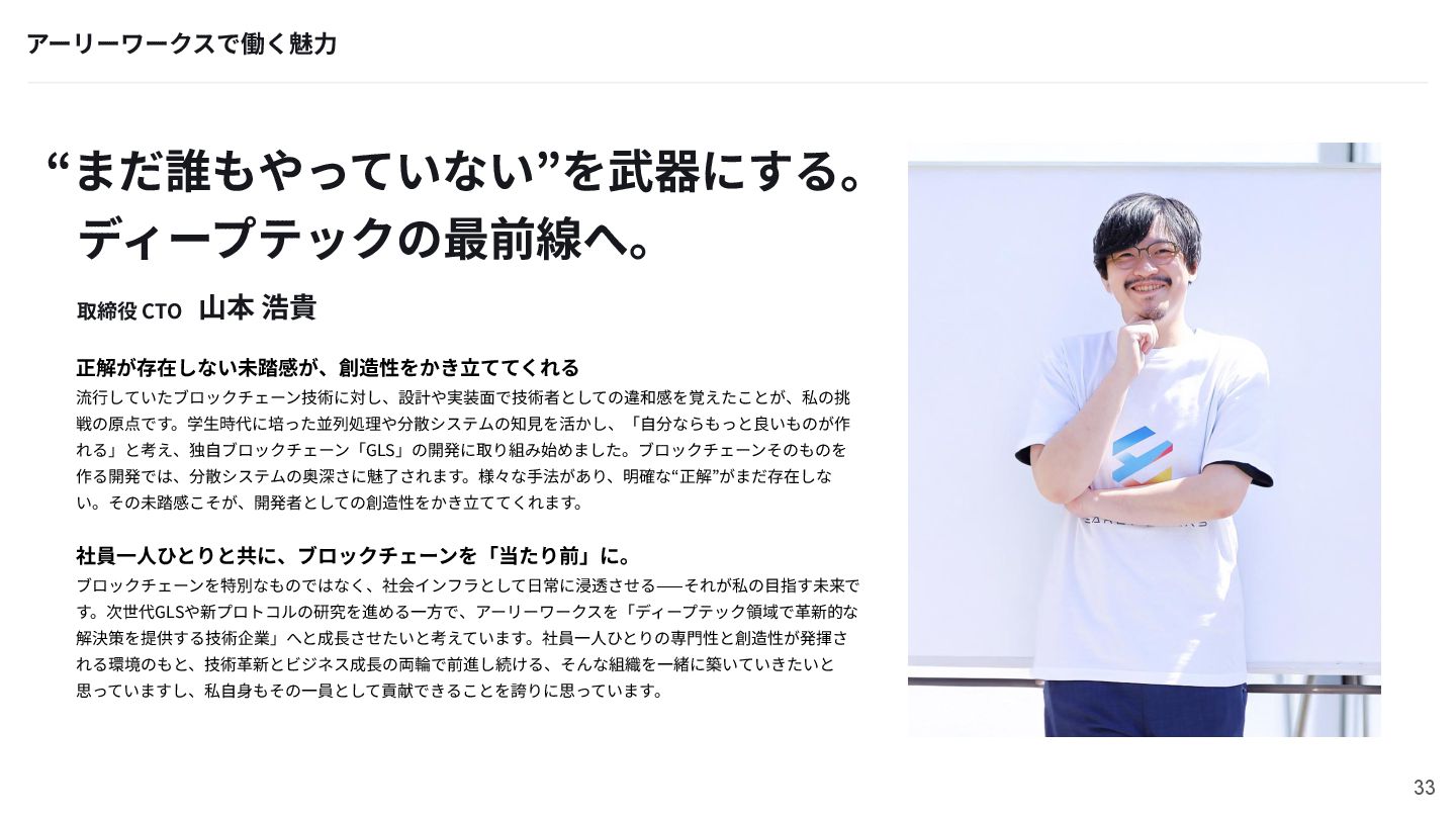 す。次世代GLSや新プロトコルの研究を進める⼀⽅で、アーリーワークスを「ディープテック領域で⾰新的な 解決策を提供する技術企業」へと成⻑させたいと考えています。社員⼀⼈ひとりの専⾨性と創造性が発揮さ れる環境のもと、技術⾰新とビジネス成⻑の両輪で前進し続ける、そんな組織を⼀緒に築いていきたいと 思っていますし、私⾃⾝もその⼀員として貢献できることを誇りに思っています。 アーリーワークスで働く魅⼒ 取締役 CTO ⼭本 浩貴 33