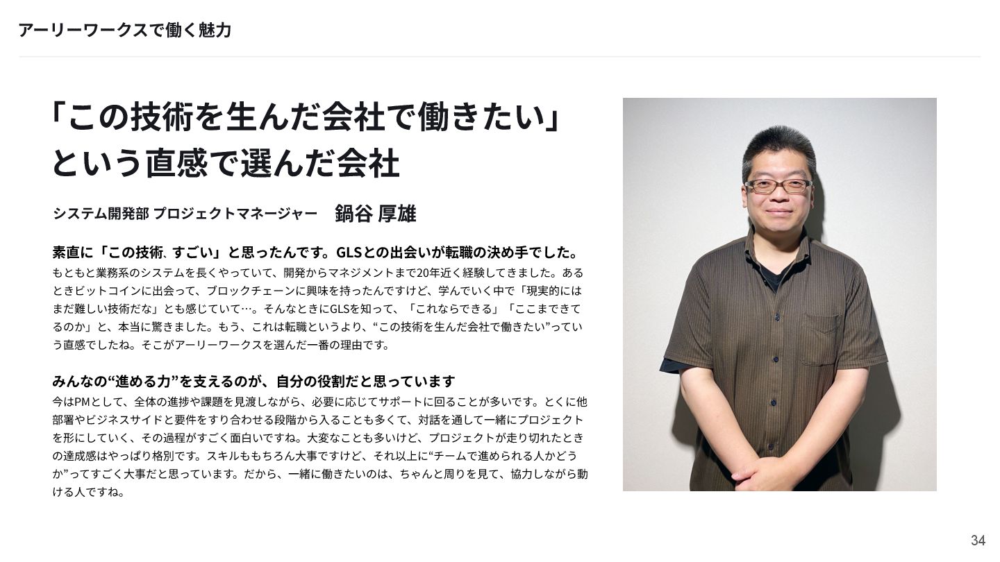 「この技術を⽣んだ会社で働きたい」 という直感で選んだ会社 アーリーワークスで働く魅⼒ システム開発部 プロジェクトマネージャー 鍋⾕ 厚雄 素直に「この技術、すごい」と思ったんです。GLSとの出会いが転職の決め⼿でした。 もともと業務系のシステムを⻑くやっていて、開発からマネジメントまで20年近く経験してきました。ある ときビットコインに出会って、ブロックチェーンに興味を持ったんですけど、学んでいく中で「現実的には