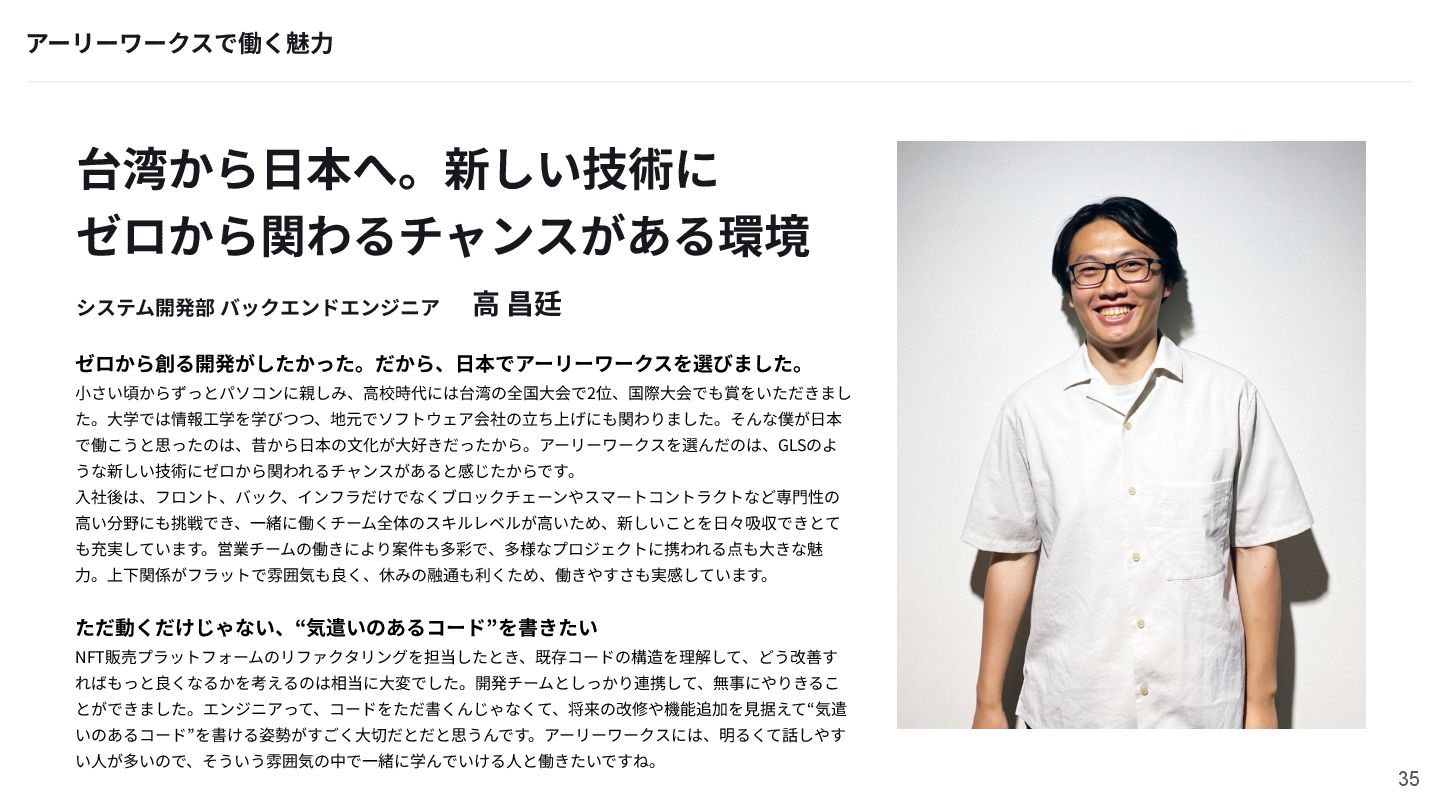 台湾から⽇本へ。新しい技術に ゼロから関わるチャンスがある環境 ゼロから創る開発がしたかった。だから、⽇本でアーリーワークスを選びました。 ⼩さい頃からずっとパソコンに親しみ、⾼校時代には台湾の全国⼤会で2位、国際⼤会でも賞をいただきまし た。⼤学では情報⼯学を学びつつ、地元でソフトウェア会社の⽴ち上げにも関わりました。そんな僕が⽇本 で働こうと思ったのは、昔から⽇本の⽂化が⼤好きだったから。アーリーワークスを選んだのは、GLSのよ うな新しい技術にゼロから関われるチャンスがあると感じたからです。 ⼊社後は、フロント、バック、インフラだけでなくブロックチェーンやスマートコントラクトなど専⾨性の ⾼い分野にも挑戦でき、⼀緒に働くチーム全体のスキルレベルが⾼いため、新しいことを⽇々吸収できとて も充実しています。営業チームの働きにより案件も多彩で、多様なプロジェクトに携われる点も⼤きな魅