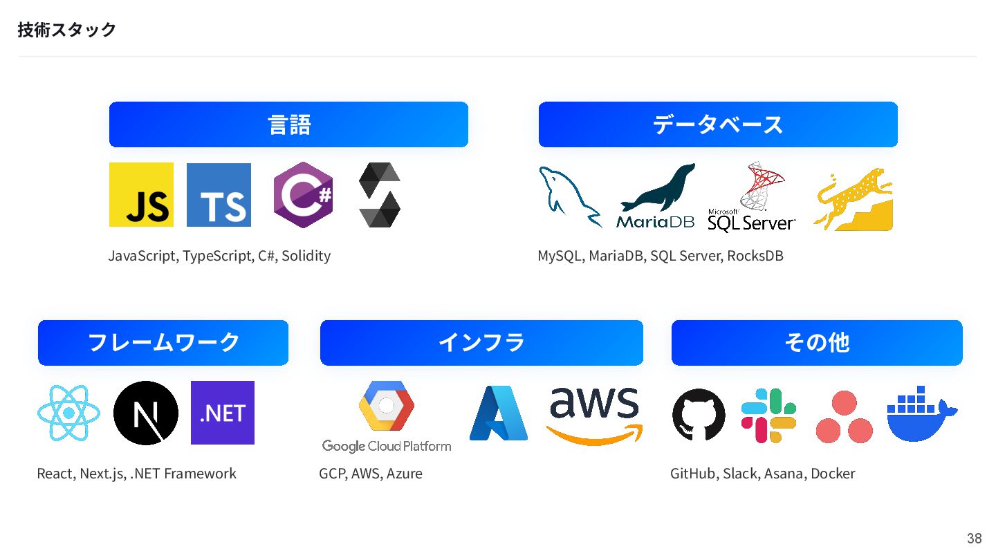 Framework データベース MySQL, MariaDB, SQL Server, RocksDB インフラ GCP, AWS, Azure その他 GitHub, Slack, Asana, Docker 38