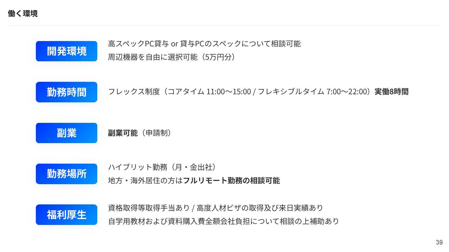 フレキシブルタイム 7:00〜22:00)実働8時間 副業 副業可能(申請制) 勤務場所 ハイブリット勤務(⽉‧⾦出社) 地⽅‧海外居住の⽅はフルリモート勤務の相談可能 福利厚⽣ 資格取得等取得⼿当あり / ⾼度⼈材ビザの取得及び来⽇実績あり ⾃学⽤教材および資料購⼊費全額会社負担について相談の上補助あり 39