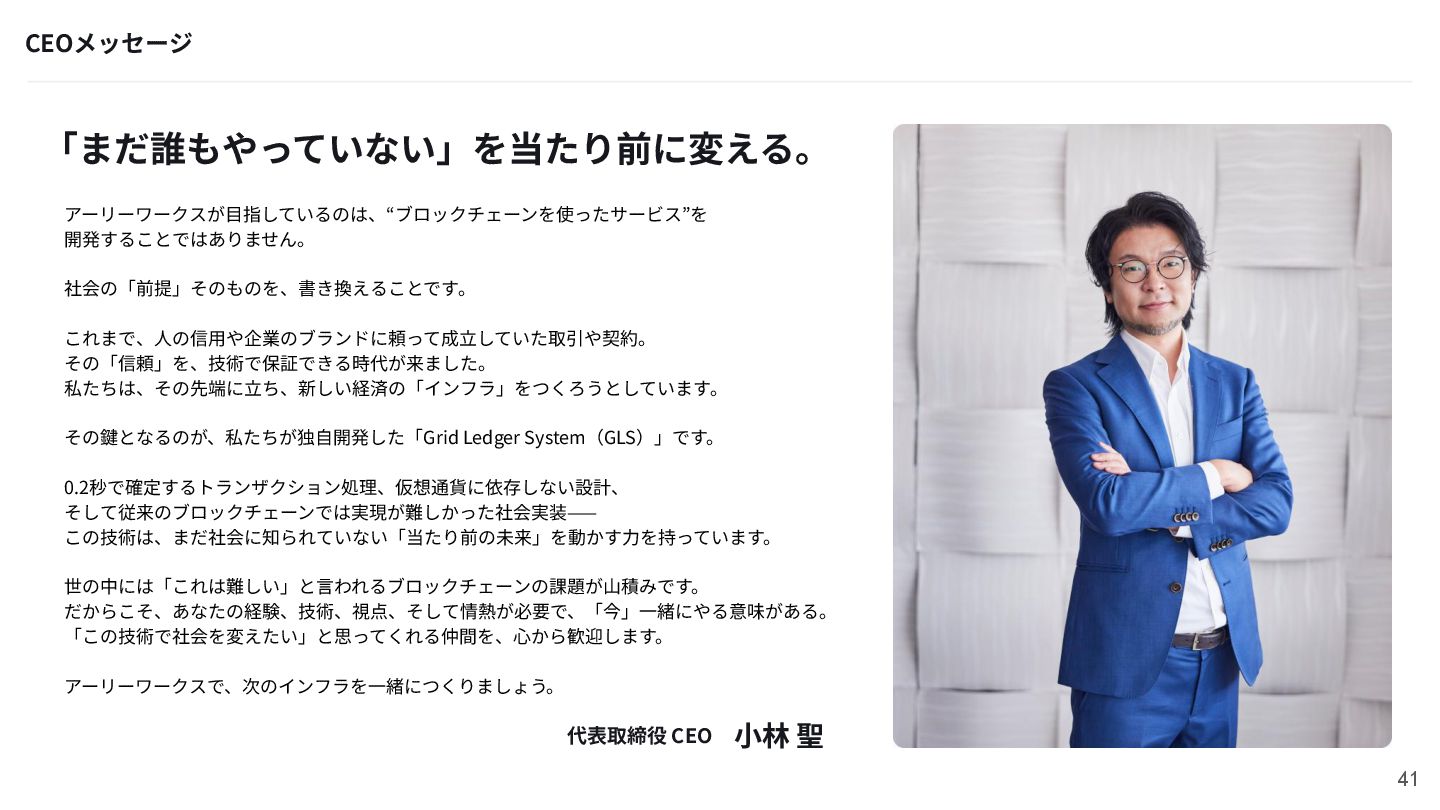 0.2秒で確定するトランザクション処理、仮想通貨に依存しない設計、 そして従来のブロックチェーンでは実現が難しかった社会実装⸺ この技術は、まだ社会に知られていない「当たり前の未来」を動かす⼒を持っています。 世の中には「これは難しい」と⾔われるブロックチェーンの課題が⼭積みです。 だからこそ、あなたの経験、技術、視点、そして情熱が必要で、「今」⼀緒にやる意味がある。 「この技術で社会を変えたい」と思ってくれる仲間を、⼼から歓迎します。 アーリーワークスで、次のインフラを⼀緒につくりましょう。 代表取締役 CEO ⼩林 聖 41 「まだ誰もやっていない」を当たり前に変える。