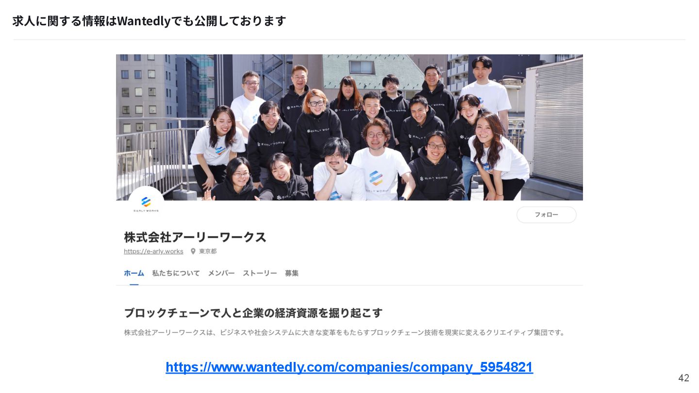 求⼈に関する情報はWantedlyでも公開しております https://www.wantedly.com/companies/company_5954821 42