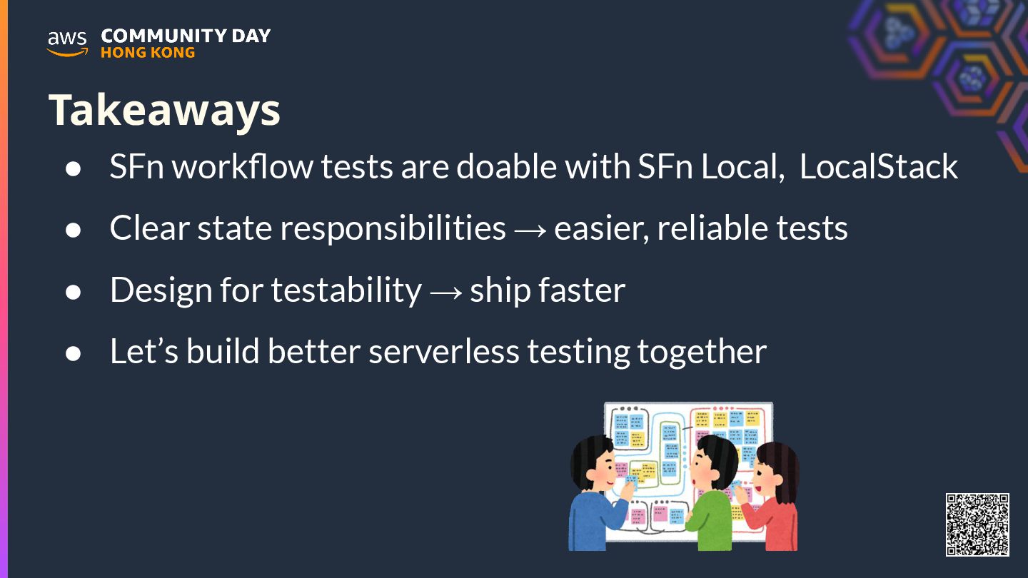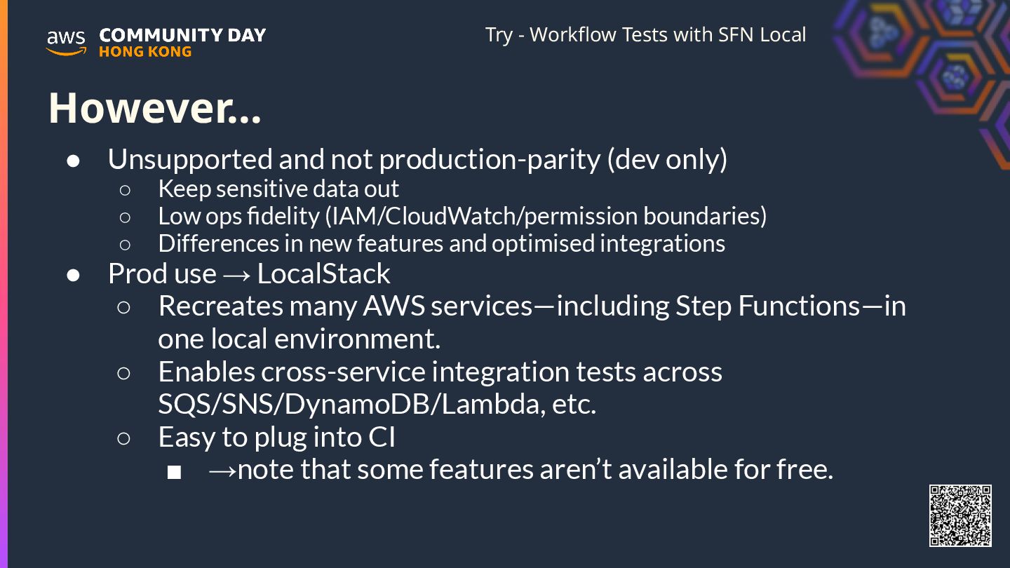 data out ◦ Low ops fidelity (IAM, CloudWatch etc.) • Prod use → LocalStack ◦ Recreates many AWS services—including Step Functions—in one local environment ◦ Easy to plug into CI ▪ →note that some features aren’t available for free. However… Try - Workflow Tests with SFN Local