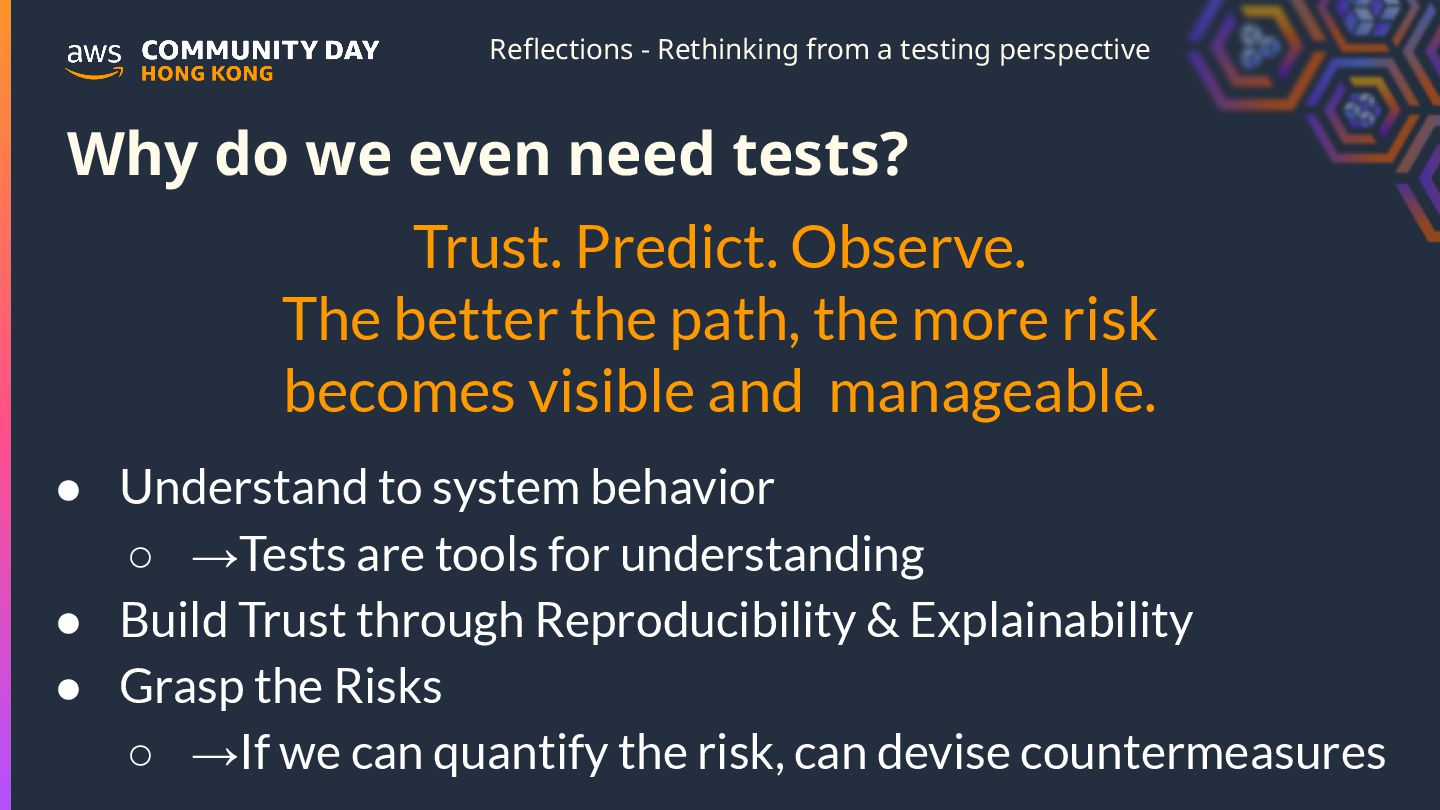 behavior ◦ →Tests are tools for understanding • Build Trust through Reproducibility & Explainability • Grasp the Risks ◦ →If we can quantify the risk, can devise countermeasures Trust. Predict. Observe. The better the path, the more risk becomes visible and manageable. Reflections - Rethinking from a testing perspective https://www.amazon.co.jp/dp/B074BQQ96X?ref =ppx_yo2ov_dt_b_fed_digi_asin_title_351