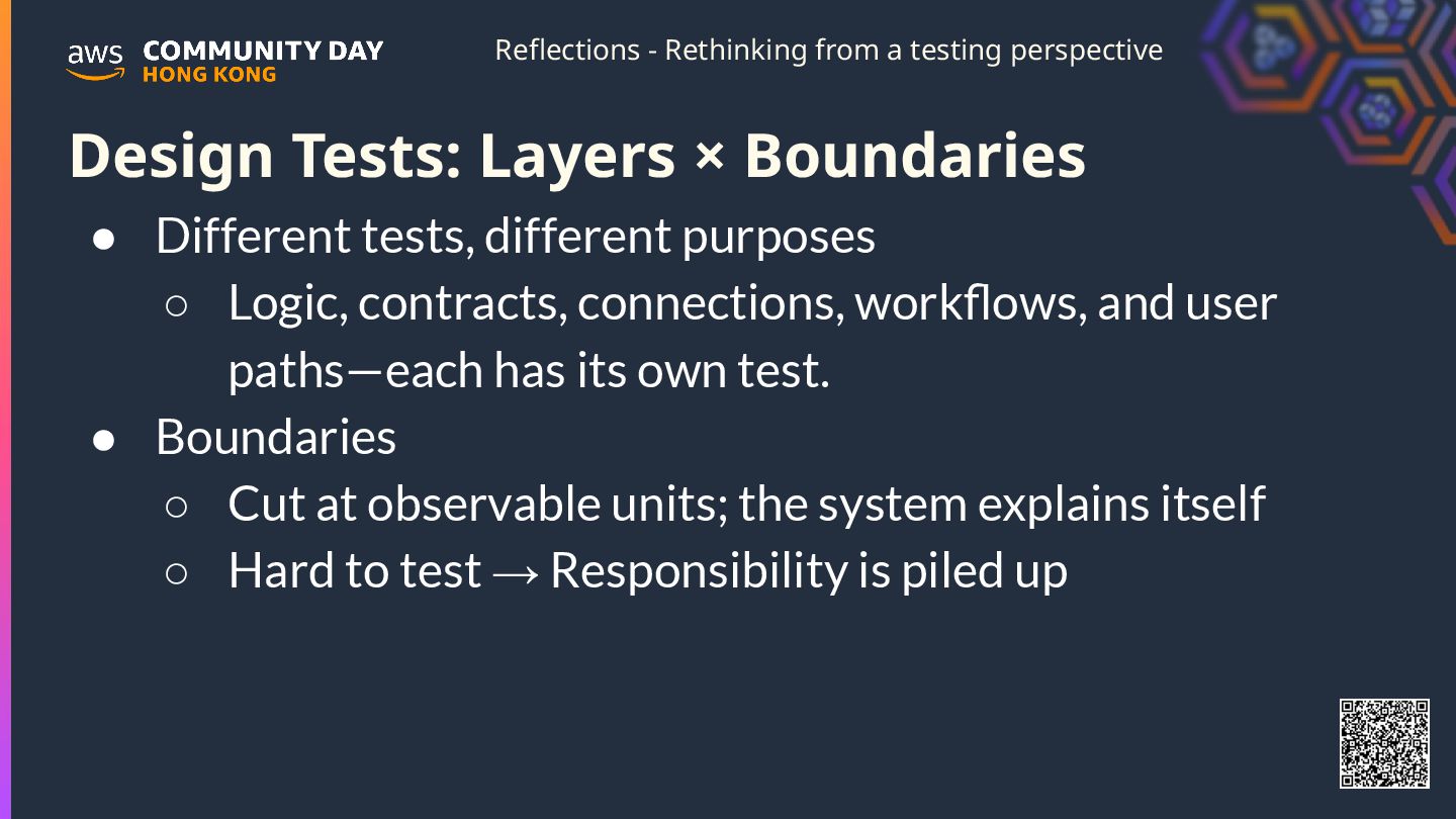 ◦ Logic, contracts, connections, workflows, and user paths—each has its own test. • Boundaries ◦ Cut at observable units; the system explains itself ◦ Hard to test → Responsibility is piled up Reflections - Rethinking from a testing perspective