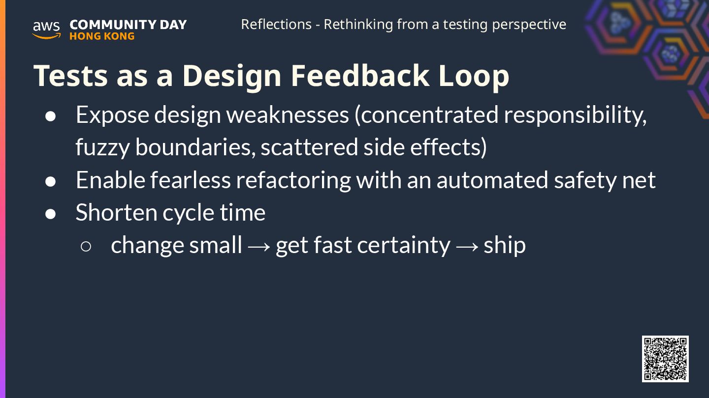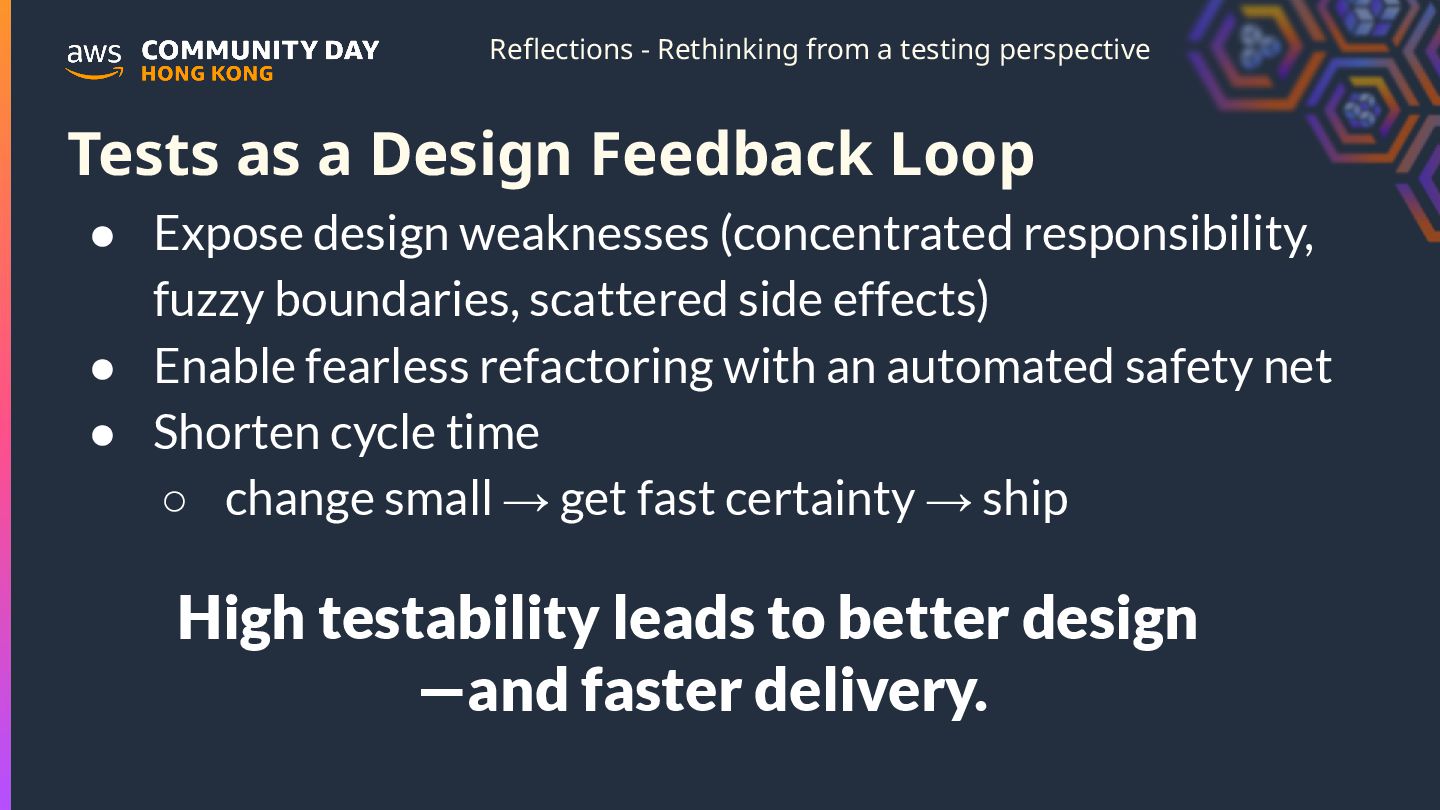 (concentrated responsibility, fuzzy boundaries, scattered side effects) • Enable fearless refactoring with an automated safety net • Shorten cycle time ◦ change small → get fast certainty → ship High testability leads to better design —and faster delivery. Reflections - Rethinking from a testing perspective
