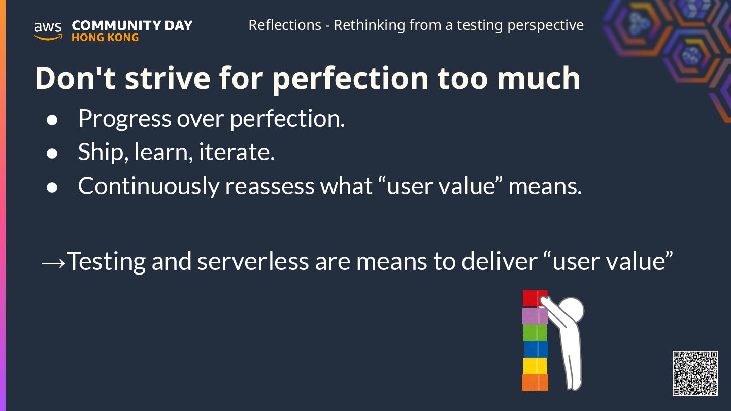 • Ship, learn, iterate. • Continuously reassess what “user value” means. →Testing and serverless are means to deliver “user value” Reflections - Rethinking from a testing perspective