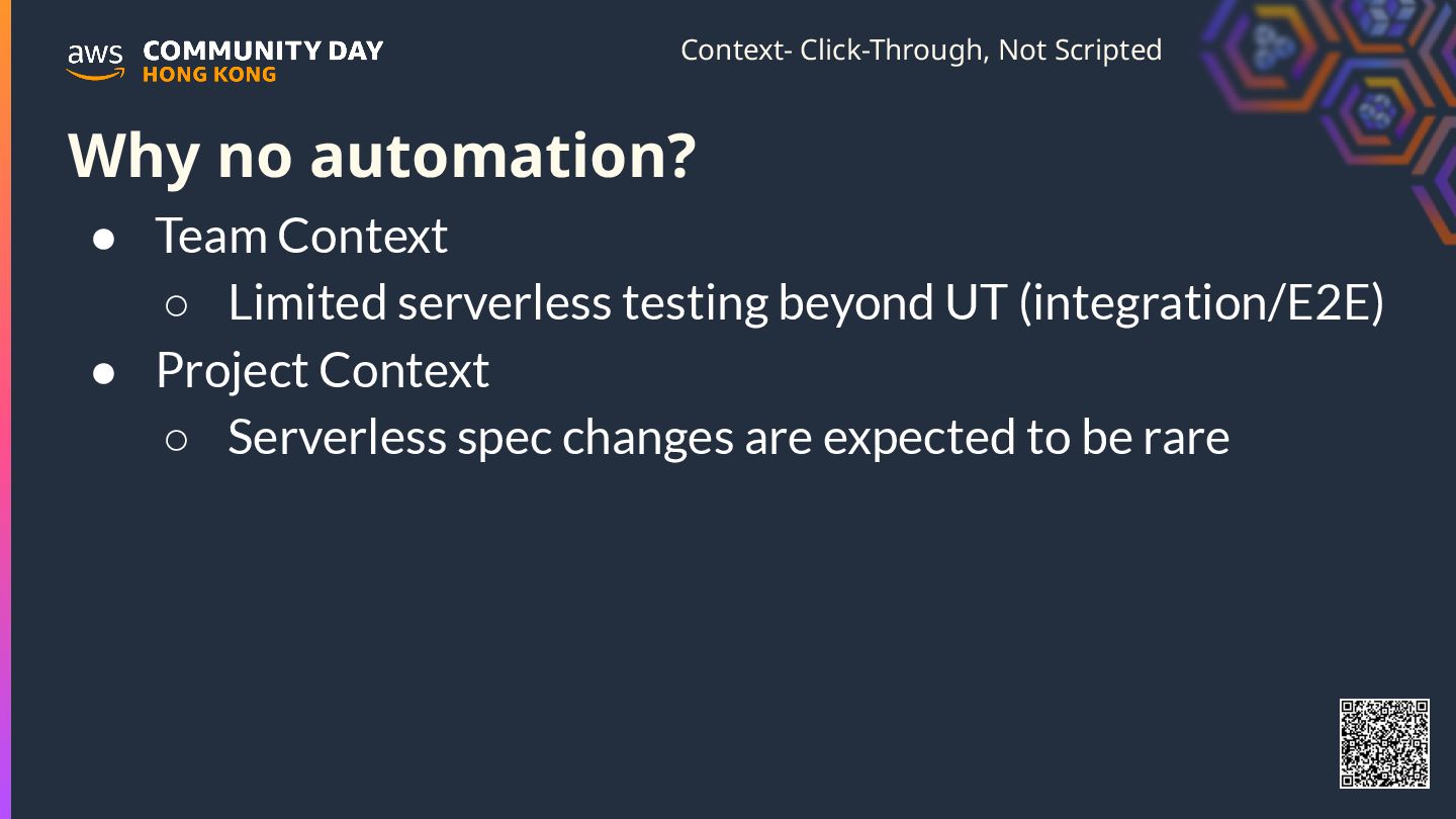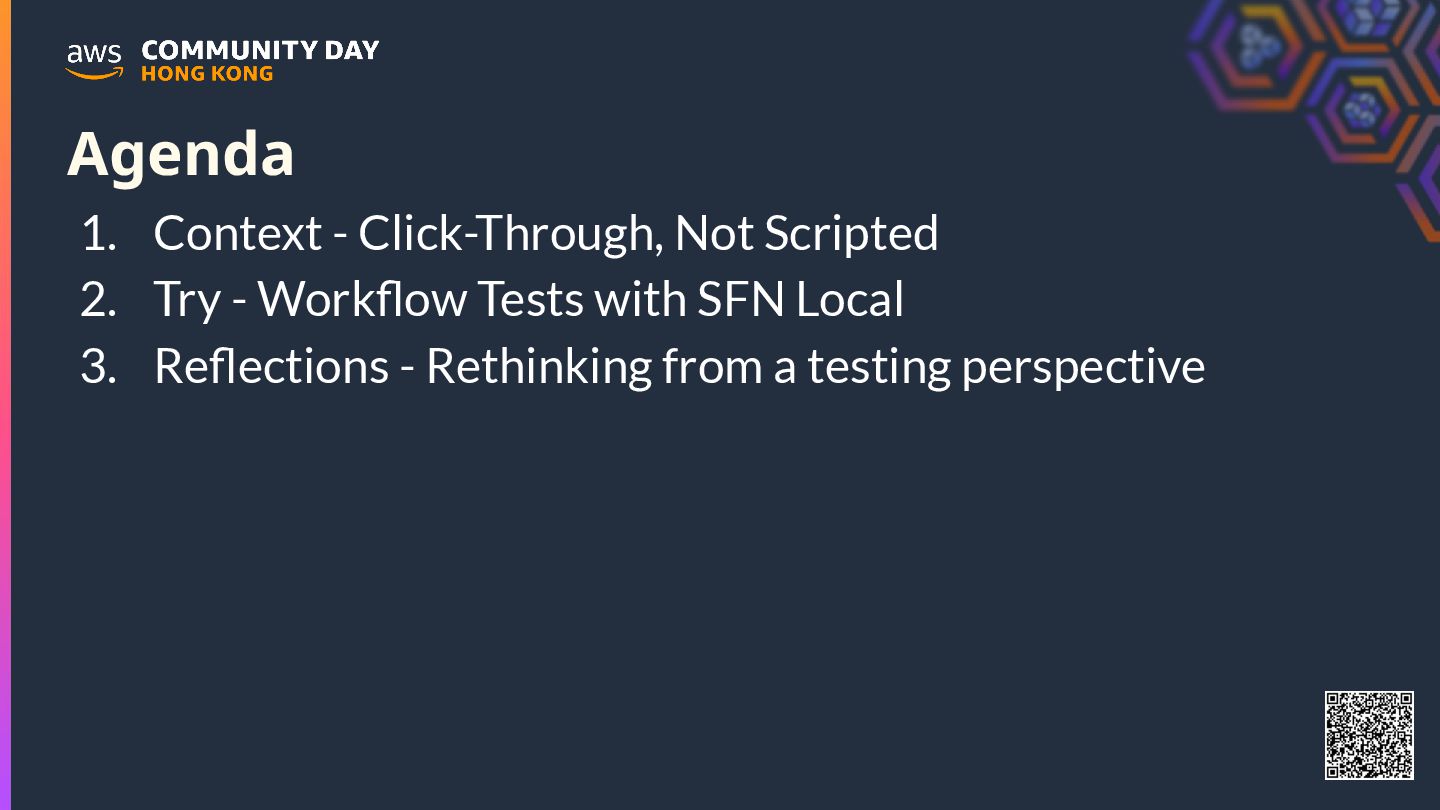 a serverless architecture • A simple three-state Step Functions workflow (all Lambda) • Unit tests exist per state, but end-to-end state machine testing is manual with visual I/O verification. Context- Click-Through, Not Scripted