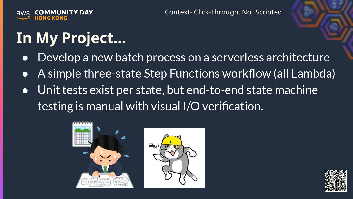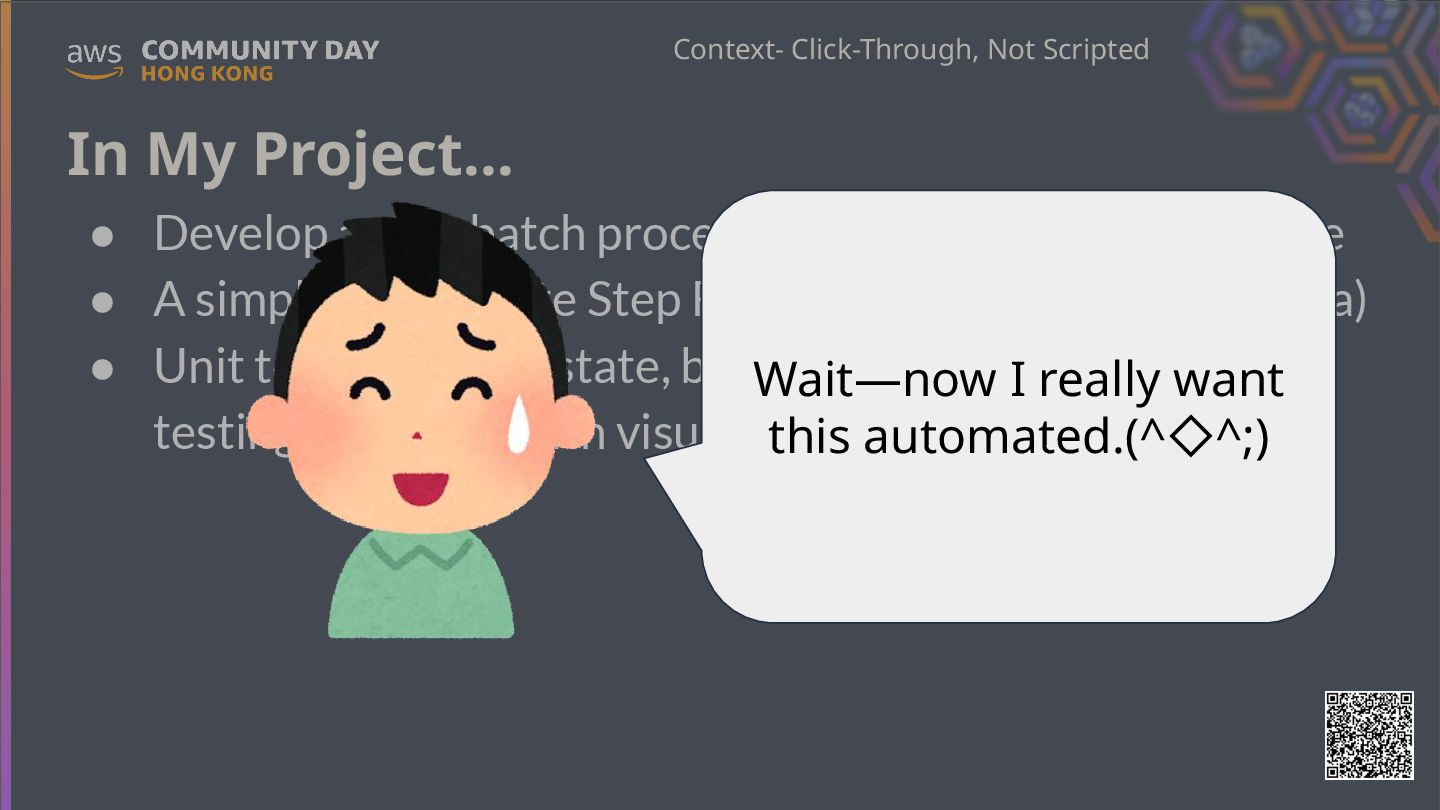 a serverless architecture • A simple three-state Step Functions workflow (all Lambda) • Unit tests exist per state, but end-to-end state machine testing is manual with visual I/O verification. Context- Click-Through, Not Scripted Wait—now I really want this automated.(^◇^;)