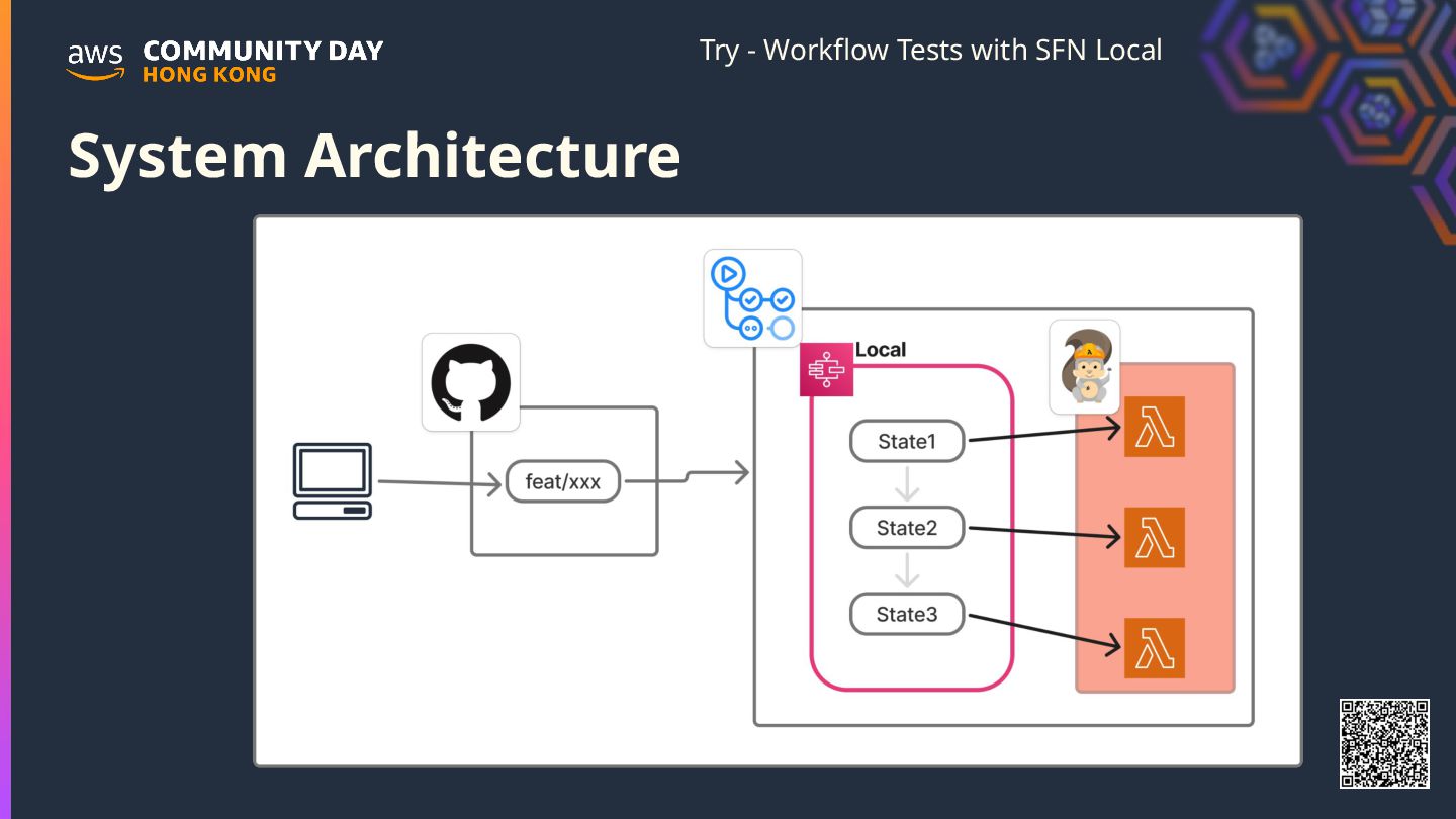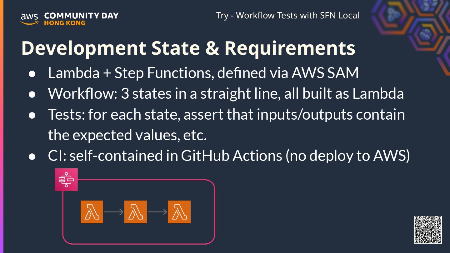 via AWS SAM • Workflow: 3 states in a straight line, all built as Lambda • Tests: for each state, assert that inputs/outputs contain the expected values, etc. • CI: self-contained in GitHub Actions (no deploy to AWS) Try - Workflow Tests with SFN Local