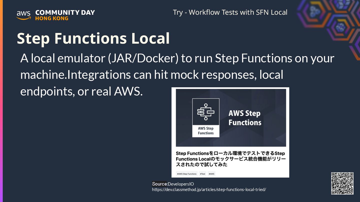 Functions on your machine.Integrations can hit mock responses, local endpoints, or real AWS. Try - Workflow Tests with SFN Local Source:DevelopersIO https://dev.classmethod.jp/articles/step-functions-local-tried/
