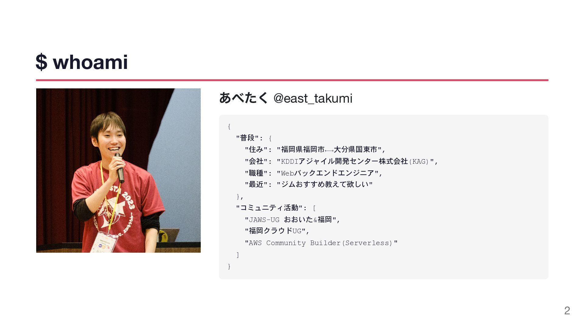 "KDDIアジャイル開発センター株式会社(KAG)", "職種": "Webバックエンドエンジニア", "最近": "ジムおすすめ教えて欲しい" }, "コミュニティ活動": [ "JAWS-UG おおいた&福岡", "福岡クラウドUG", "AWS Community Builder(Serverless)" ] } 2