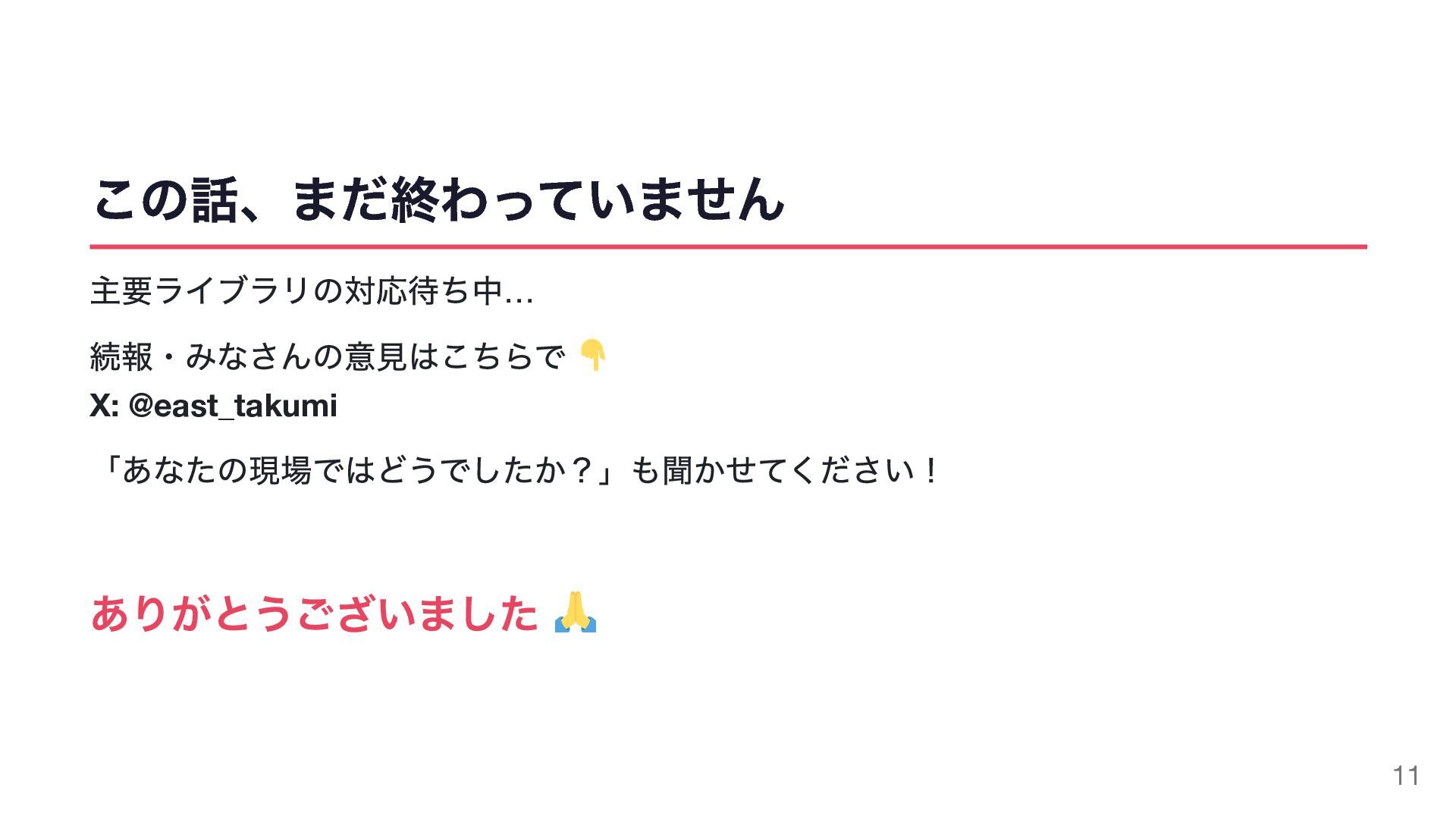 この話、まだ終わっていません 主要ライブラリの対応待ち中… 続報・みなさんの意見はこちらで X: @east_takumi 「あなたの現場ではどうでしたか?」も聞かせてください! ありがとうございました 11