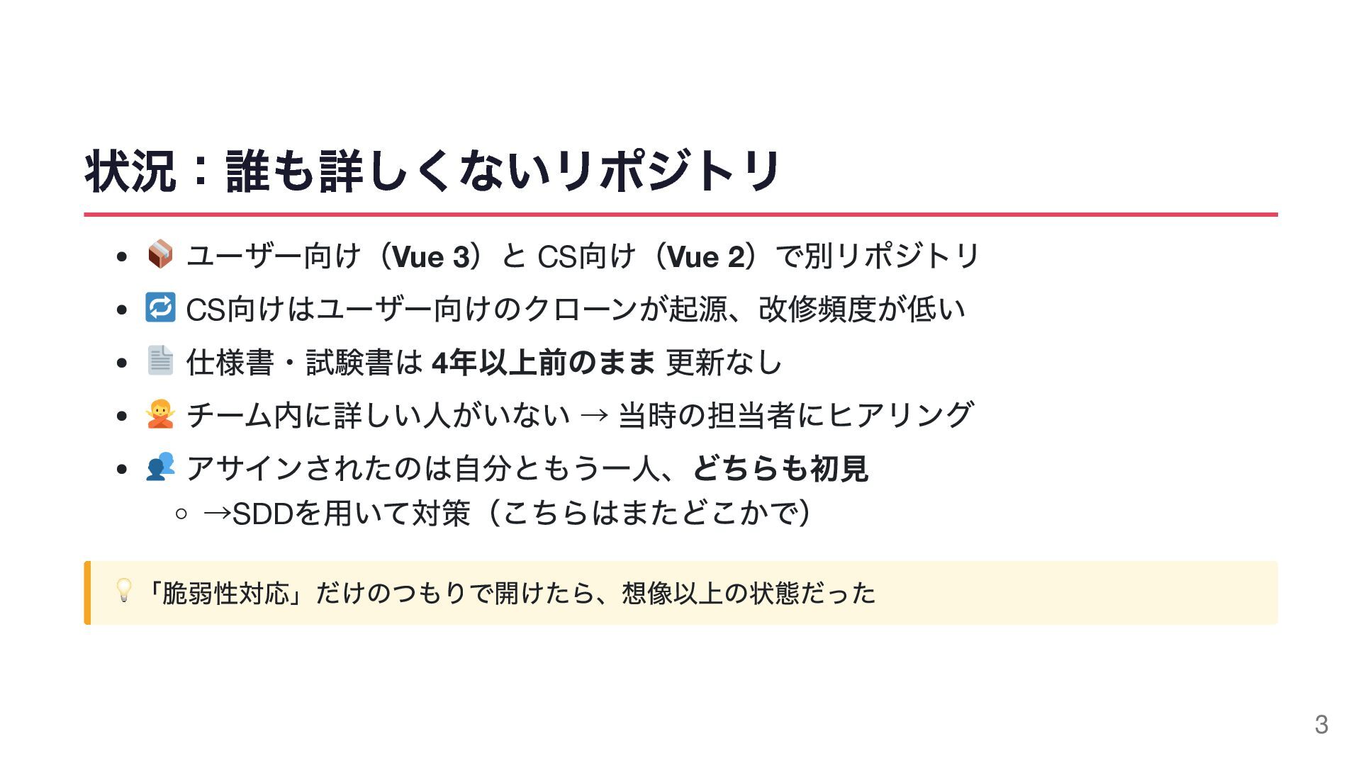 仕様書・試験書は 4 年以上前のまま 更新なし チーム内に詳しい人がいない → 当時の担当者にヒアリング アサインされたのは自分ともう一人、どちらも初見 →SDD を用いて対策(こちらはまたどこかで) 💡「脆弱性対応」だけのつもりで開けたら、想像以上の状態だった 3