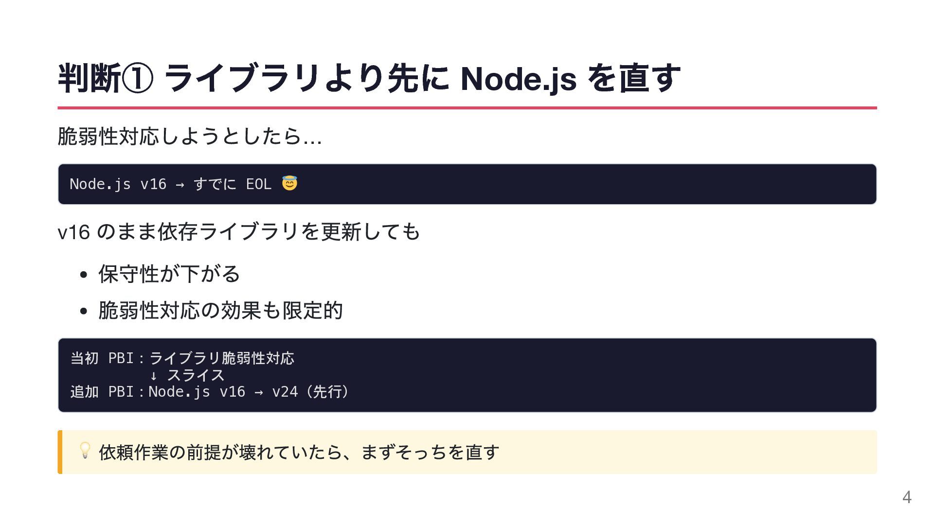 判断① ライブラリより先に Node.js を直す 脆弱性対応しようとしたら… Node.js v16 → すでに EOL