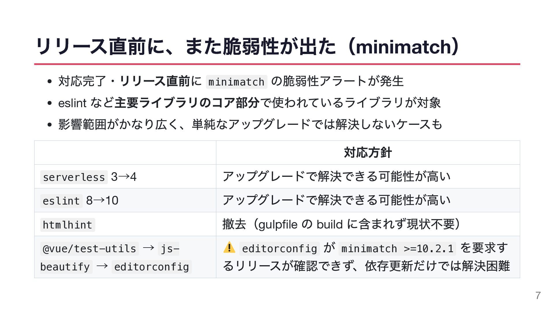 リリース直前に、また脆弱性が出た(minimatch ) 対応完了・リリース直前に minimatch の脆弱性アラートが発生 eslint など主要ライブラリのコア部分で使われているライブラリが対象 影響範囲がかなり広く、単純なアップグレードでは解決しないケースも 対応方針 serverless