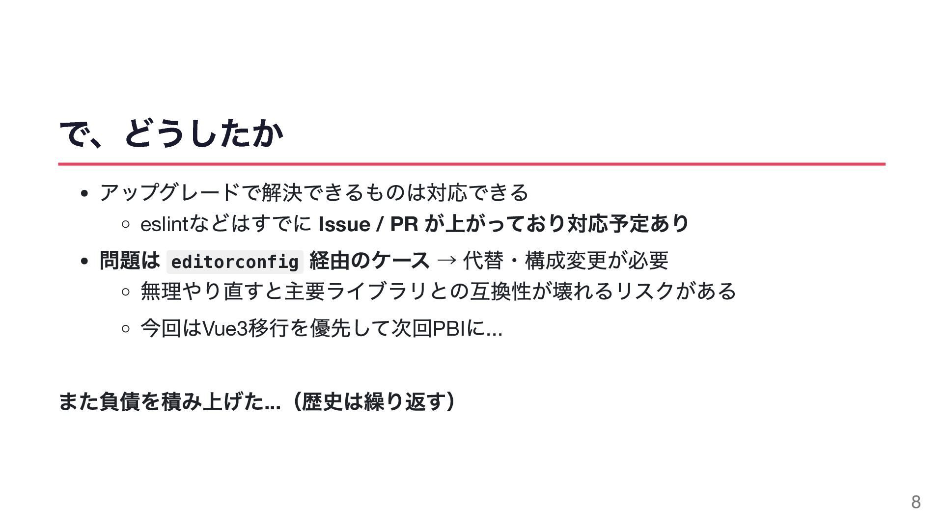 経由のケース → 代替・構成変更が必要 無理やり直すと主要ライブラリとの互換性が壊れるリスクがある 今回はVue3 移行を優先して次回PBI に... また負債を積み上げた... (歴史は繰り返す) 8